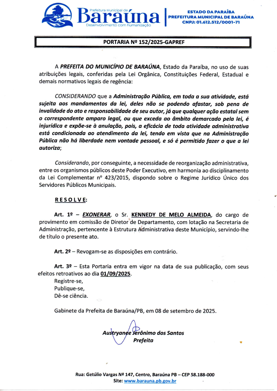 PORTARIA Nº 152/2025-GAPREF - EXONERAR KENNEDY DE MELO ALMEIDA, DO CARGO DE PROVIMENTO EM COMISSÃO DE DIRETOR DE DEPARTAMENTO. - 17 DE SETEMBRO DE 2025.