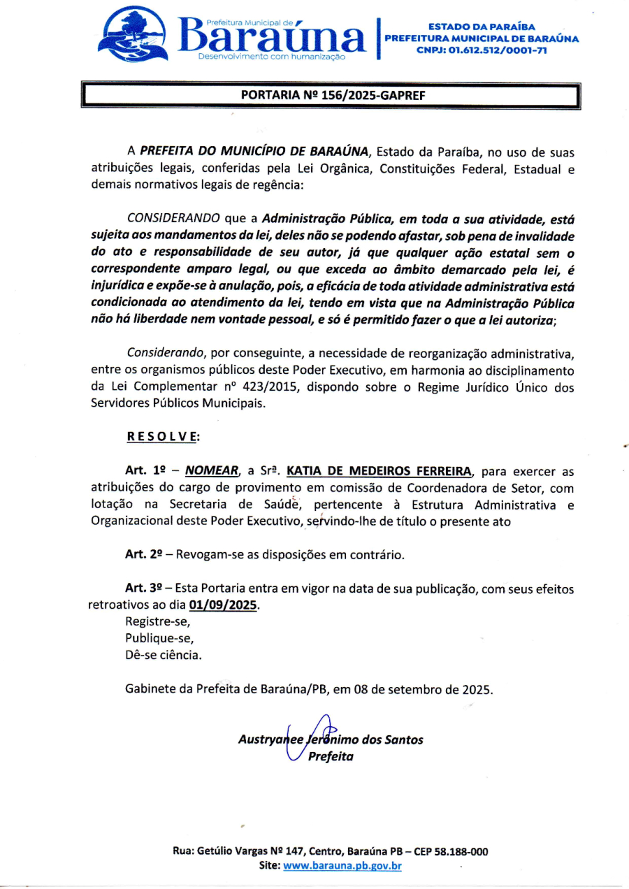 PORTARIA Nº 156/2025-GAPREF - NOMEAR KATIA DE MEDEIROS FERREIRA, PARA O CARGO DE PROVIMENTO EM COMISSÃO DE COORDENADORA DE SETOR. - 17 DE SETEMBRO DE 2025.