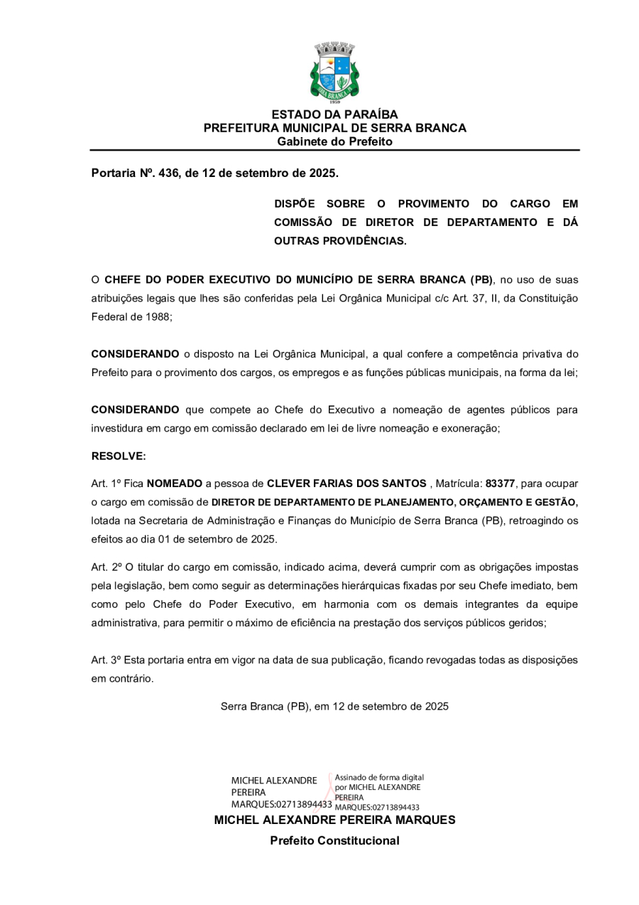 PORTARIA N° 0436/2025 - NOMEAÇÃO DE CLEVER FARIAS DOS SANTOS