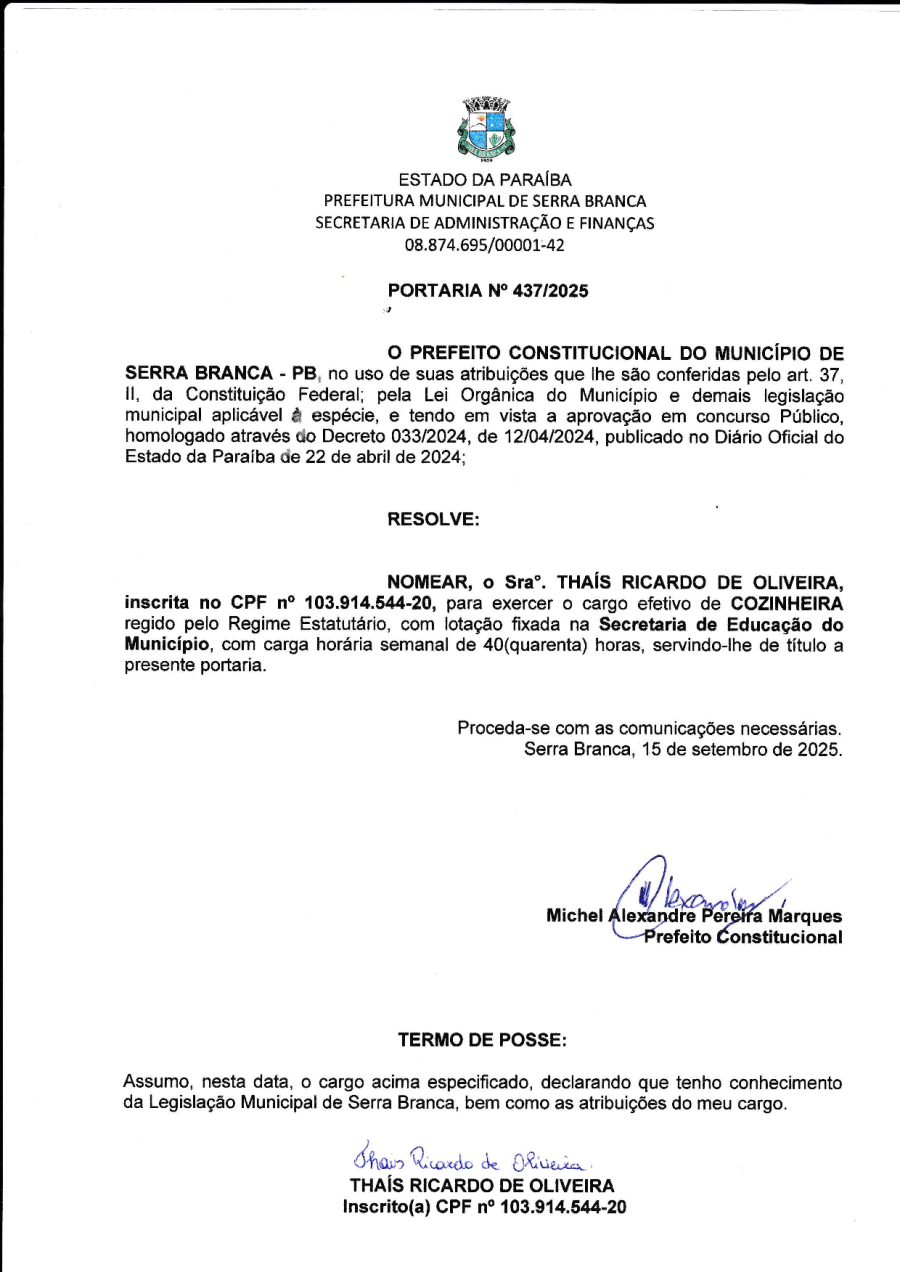 PORTARIA N° 0437/2025 - NOMEAÇÃO DE THAÍS RICARDO DE OLIVE|RA