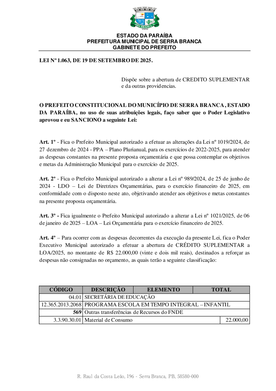 LEI N° 1063/2025 - DISPÕE SOBRE A ABERTURA DE CREDITO SUPLEMENTAR