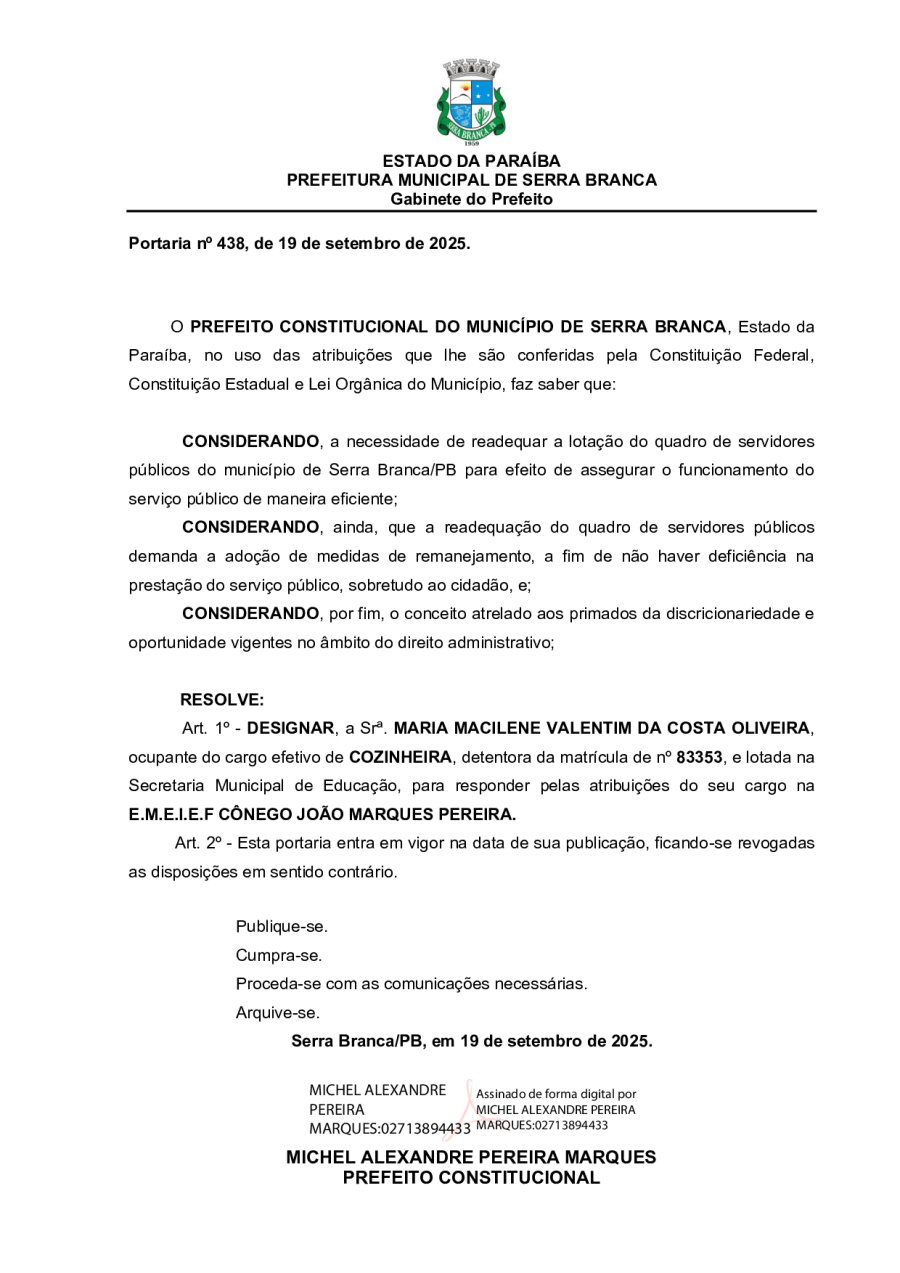 PORTARIA N° 0438/2025 - DESIGNAR A SRª MARIA MACILENE VALENTIM DA COSTA OLIVEIRA