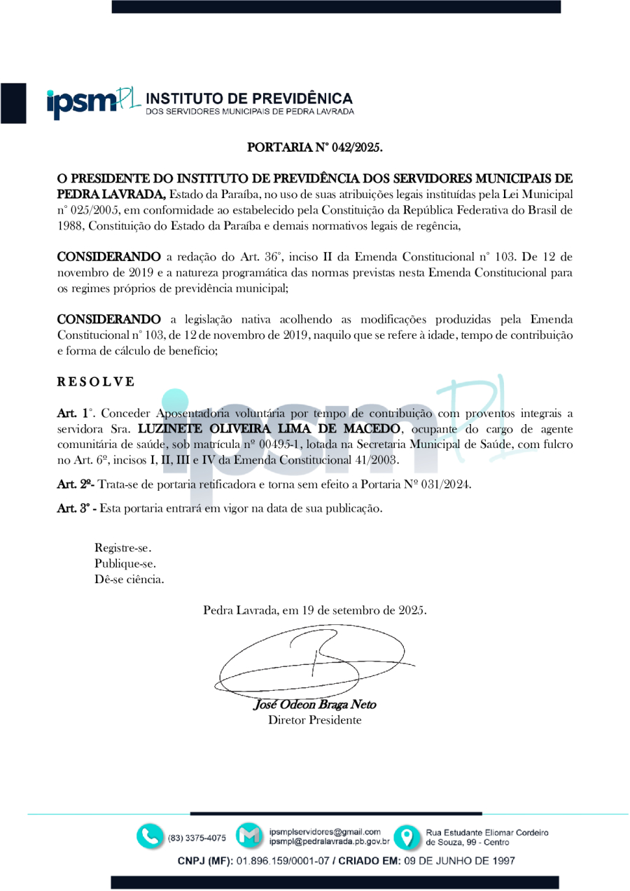 PORTARIA N° 0042/2025 - CONCEDER APOSENTADORIA VOLUNTÁRIA POR TEMPO DE CONTRIBUIÇÃO A SERVIDORA SRA. LUZINETE OLIVEIRA LIMA DE MACEDO