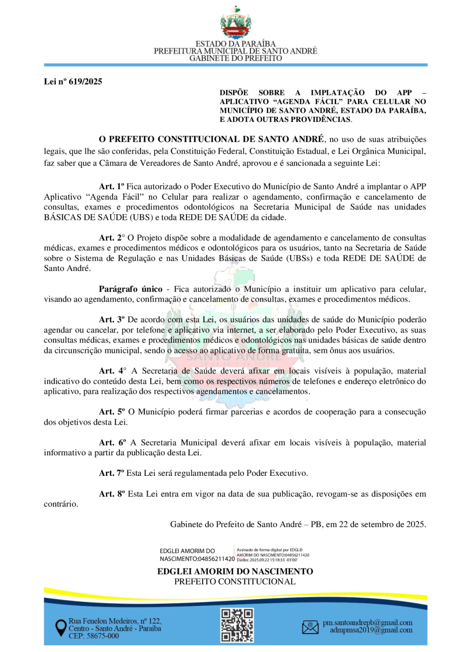 LEI Nº 619/2025 - DISPÕE SOBRE A IMPLATAÇÃO DO APP – APLICATIVO “AGENDA FÁCIL” PARA CELULAR NO MUNICÍPIO DE SANTO ANDRÉ, ESTADO DA PARAÍBA, E ADOTA OUTRAS PROVIDÊNCIAS
