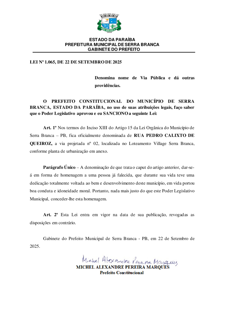 LEI N° 1065/2025 - DENOMINA NOME DE VIA PÚBLICA