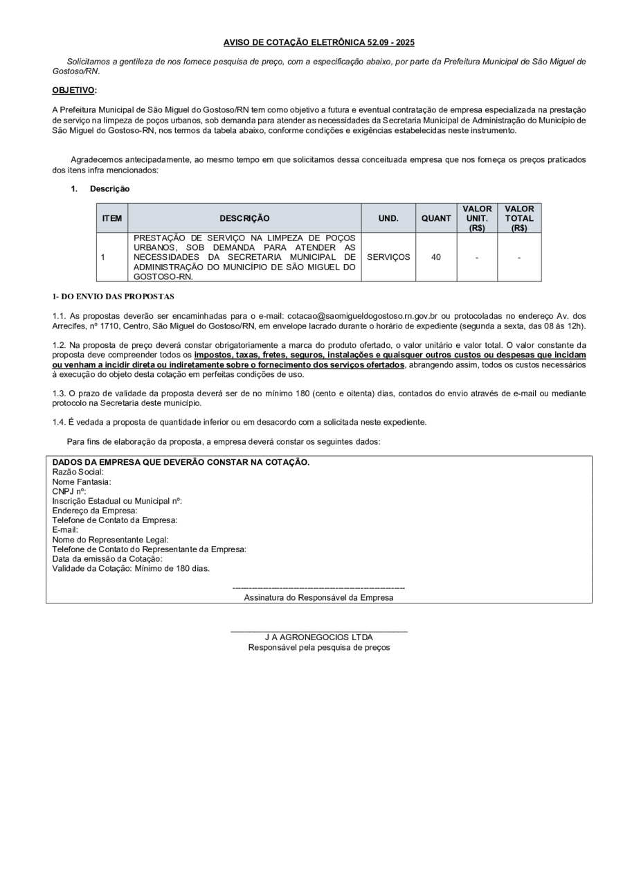 AVISO DE COTAÇÃO ELETRÔNICA 52.09 - 2025