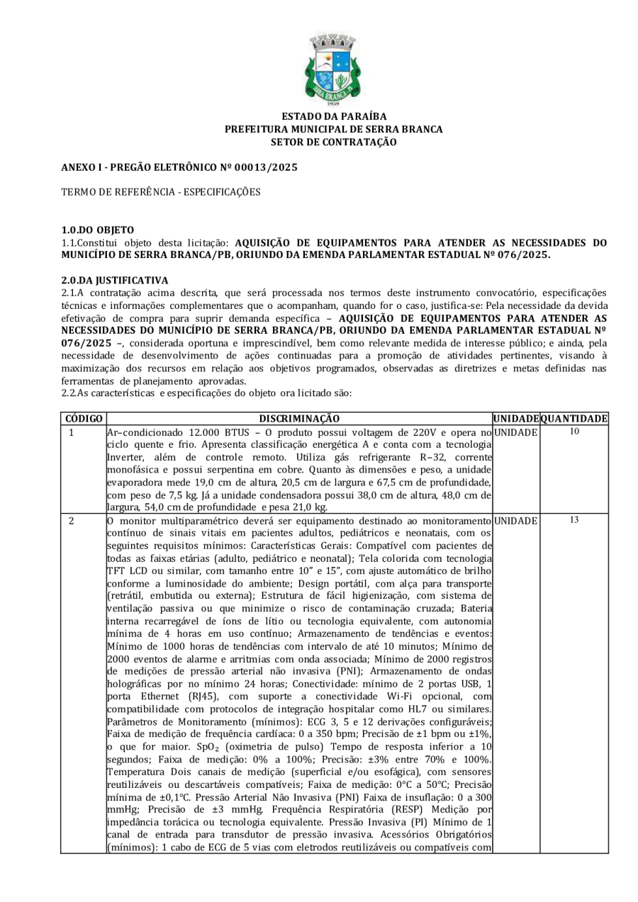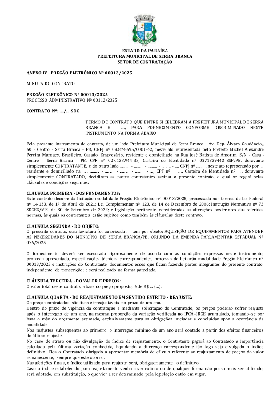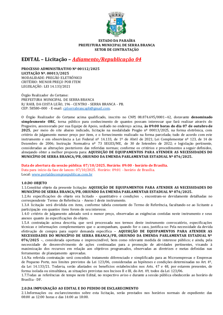 EDITAL LICITAÇÃO - REPUBLICAÇÃO 04 - PE 00013/2025 - AQUISIÇÃO DE EQUIPAMENTOS PARA ATENDER AS NECESSIDADES DO MUNICÍPIO DE SERRA BRANCA/PB, ORIUNDO DA EMENDA PARLAMENTAR ESTADUAL Nº 076/2025.