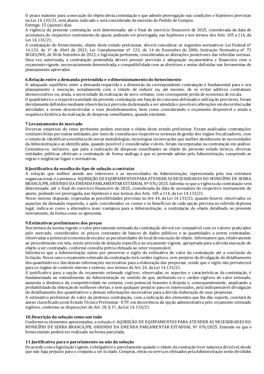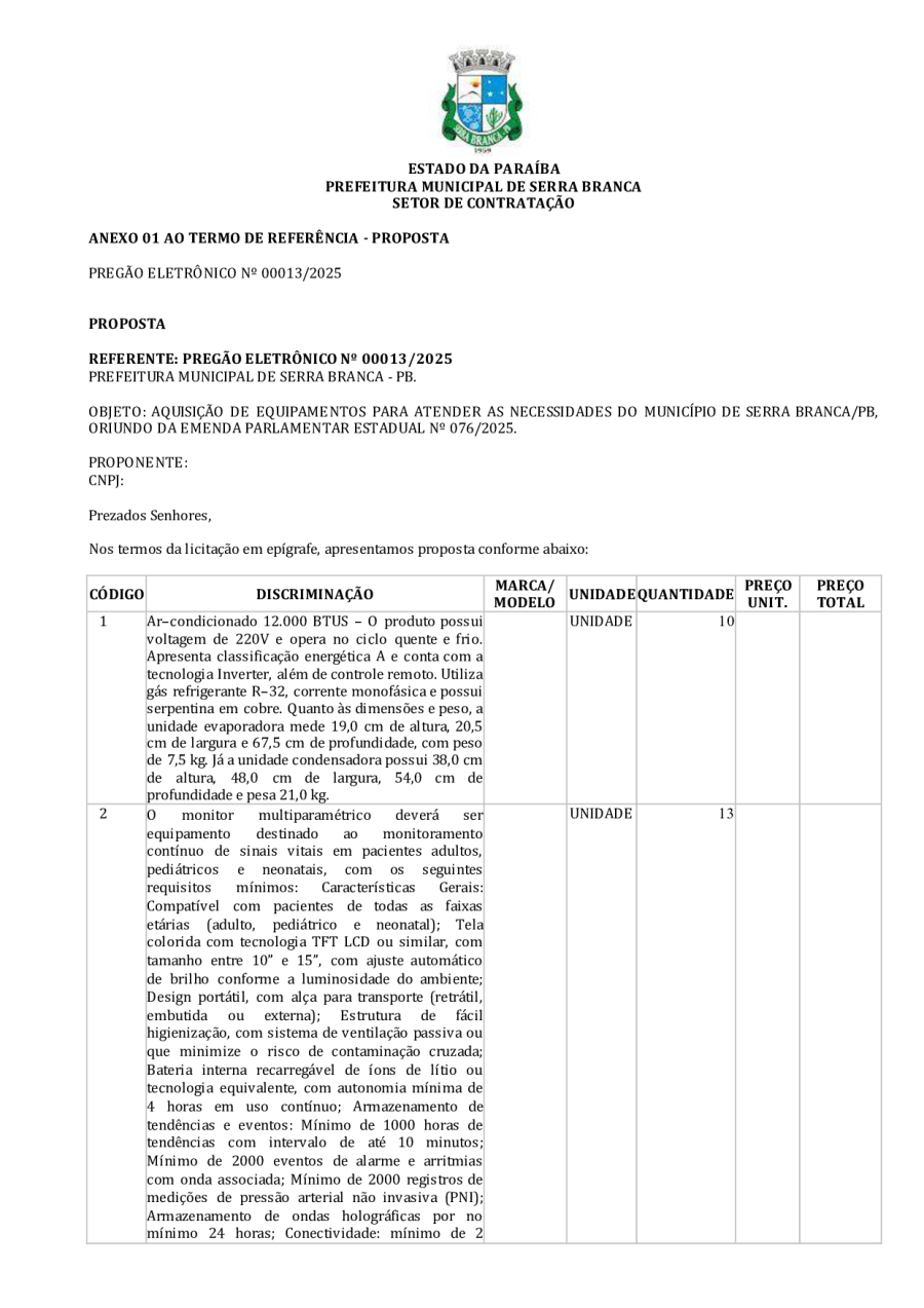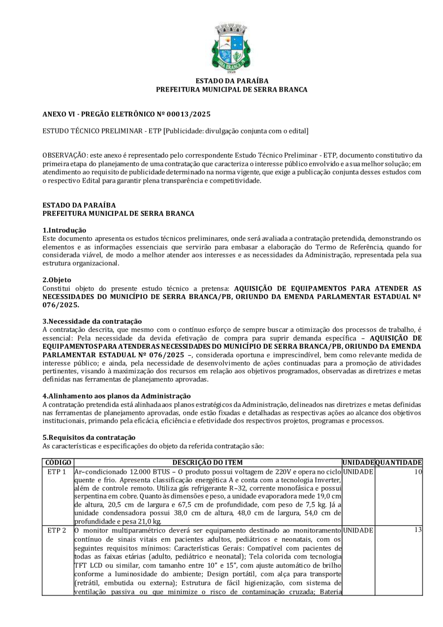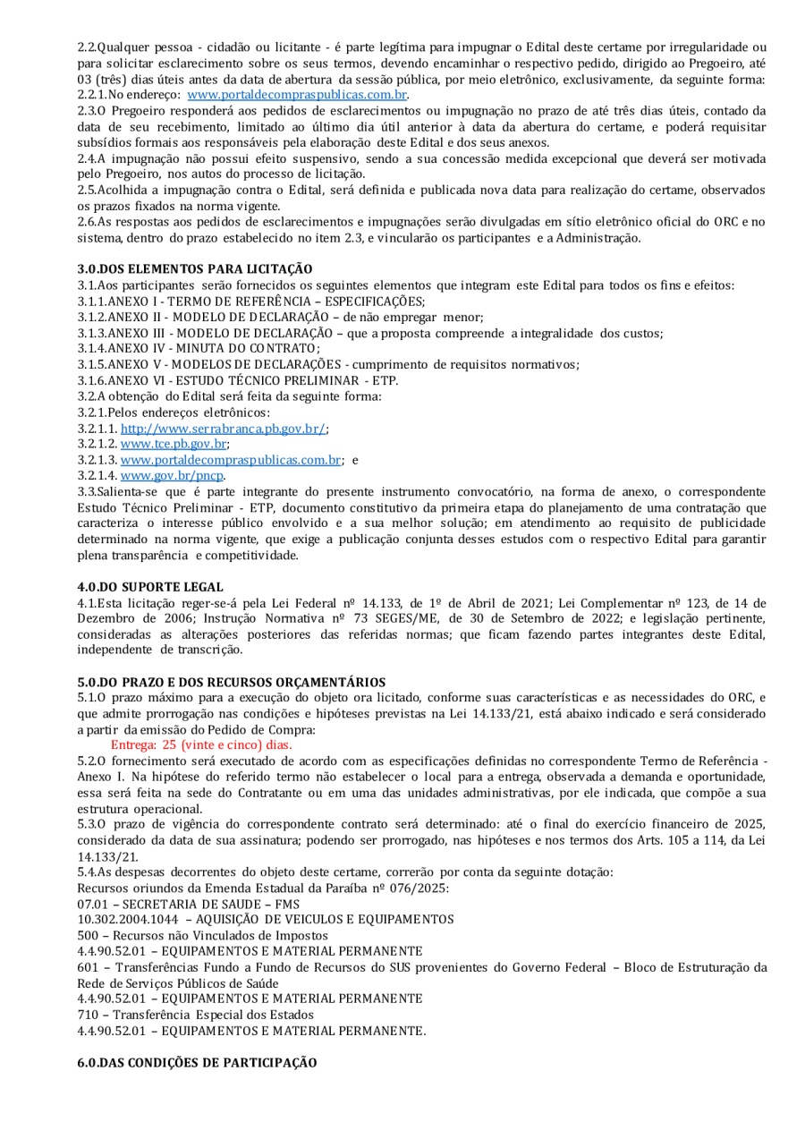 EDITAL LICITAÇÃO - REPUBLICAÇÃO 04 - PE 00013/2025 - AQUISIÇÃO DE EQUIPAMENTOS PARA ATENDER AS NECESSIDADES DO MUNICÍPIO DE SERRA BRANCA/PB, ORIUNDO DA EMENDA PARLAMENTAR ESTADUAL Nº 076/2025.