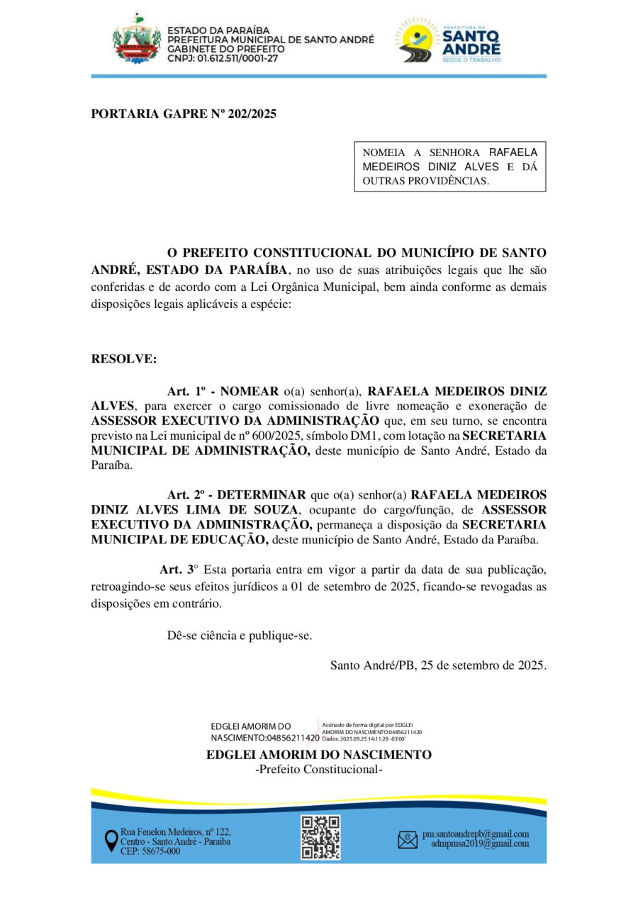 PORTARIA GAPRE Nº 202/2025 - NOMEIA A SENHORA RAFAELA MEDEIROS DINIZ ALVES E DÁ OUTRAS PROVIDÊNCIAS.