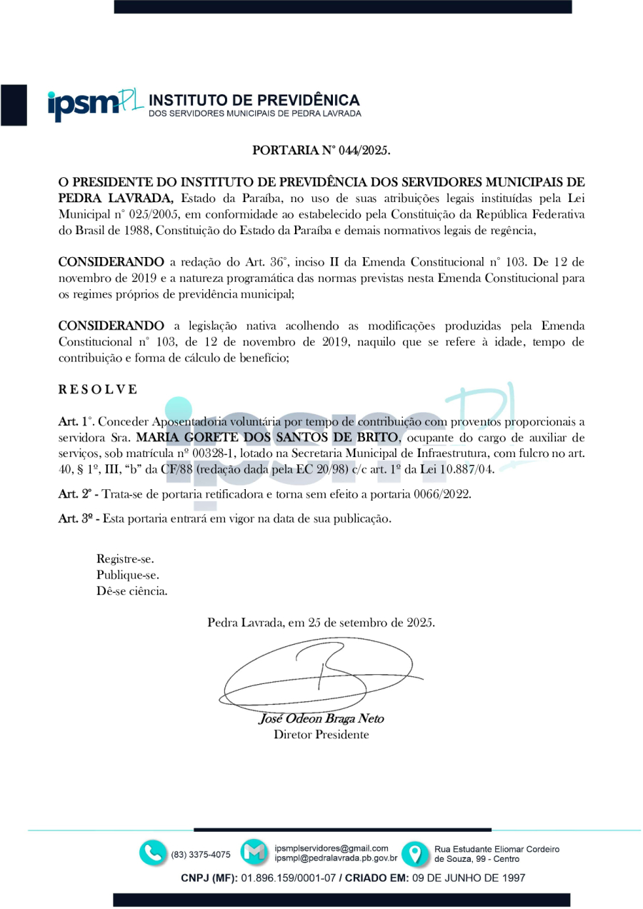 PORTARIA N° 0044/2025 - CONCEDER APOSENTADORIA VOLUNTÁRIA POR TEMPO DE CONTRIBUIÇÃO A SERVIDORA SRA. MARIA GORETE DOS SANTOS DE BRITO