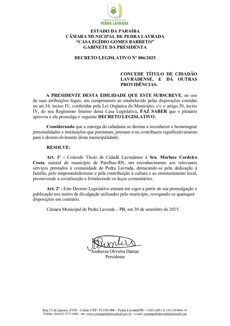 DECRETO LEGISLATIVO N° 006/2025 - CONCEDE TÍTULO DE CIDADÃO LAVRADENSE