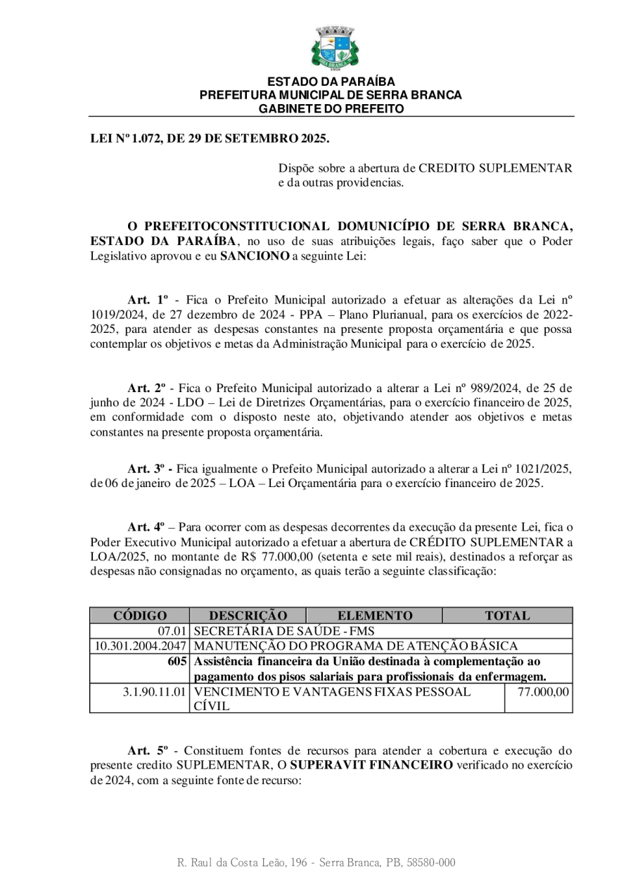 LEI N° 1072/2025 - DISPÕE SOBRE A ABERTURA DE CREDITO SUPLEMENTAR