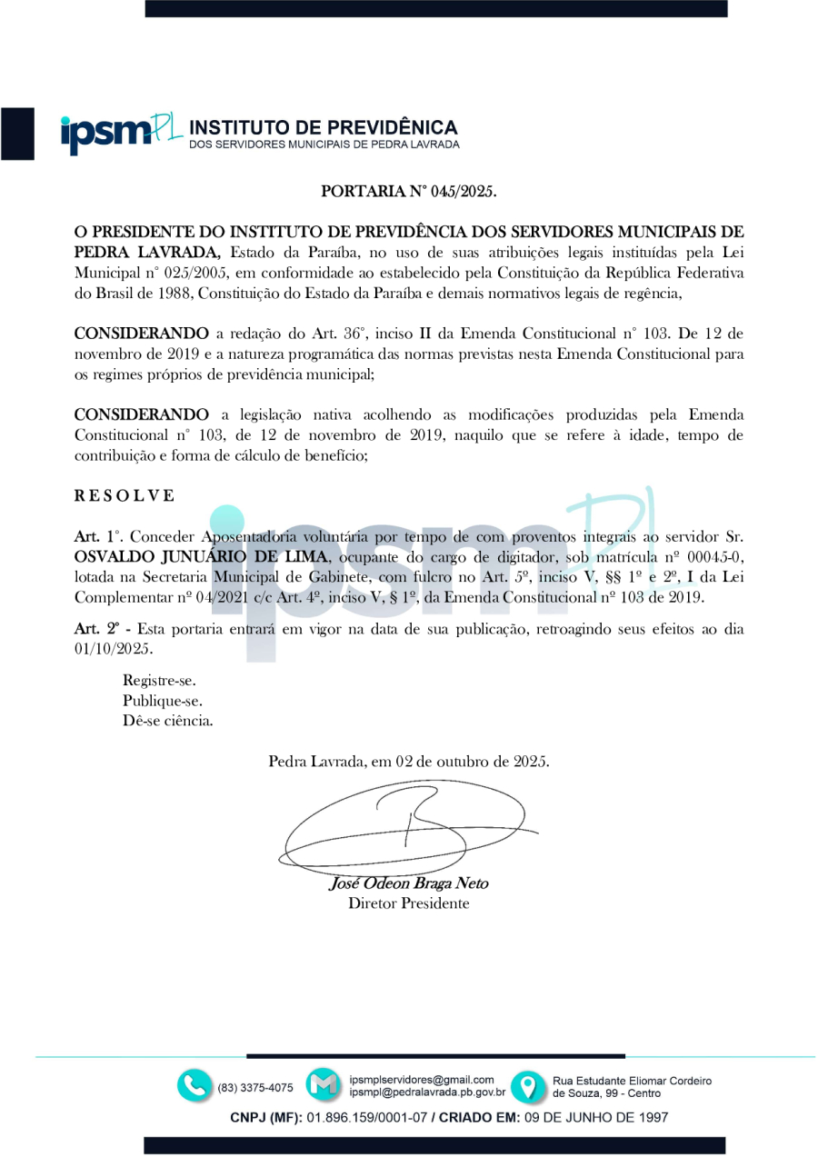 PORTARIA N° 0045/2025 - CONCEDER APOSENTADORIA VOLUNTÁRIA POR TEMPO DE COM PROVENTOS INTEGRAIS AO SERVIDOR SR. OSVALDO JUNUÁRIO DE LIMA