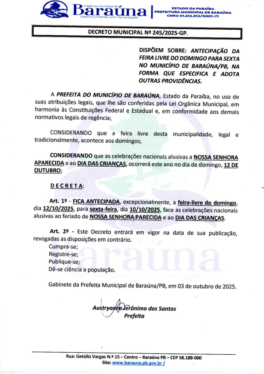 DECRETO MUNICIPAL Nº 245/2025-GP - DISPÕEM SOBRE ANTECIPAÇÃO DA FEIRA LIVRE DO DOMINGO PARA SEXTA NO MUNICIPIO DE BARAÚNA/PB, NA FORMA QUE ESPECIFICA E ADOTA OUTRAS PROVIDÊNCIAS. - 03 DE OUTUBRO DE 2025.