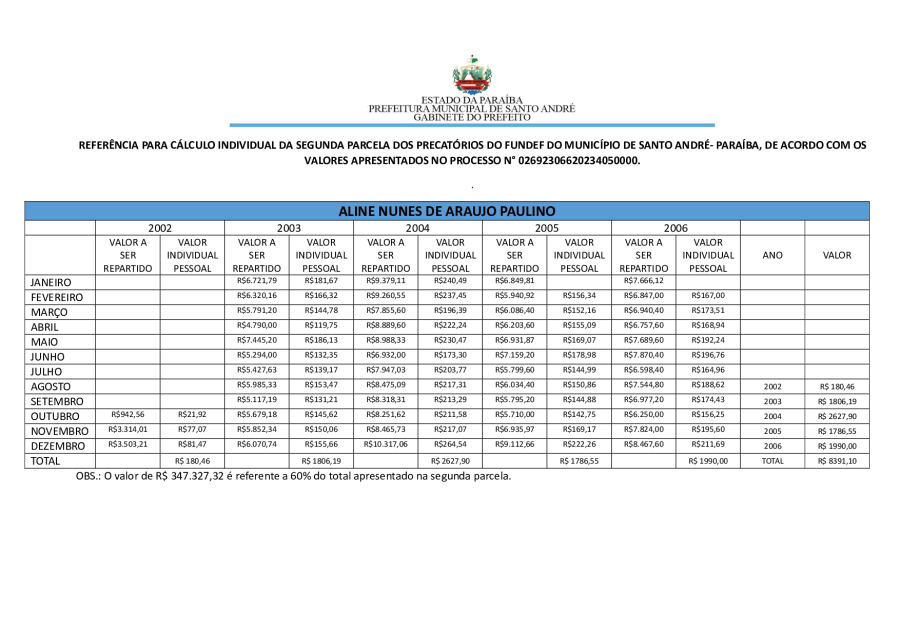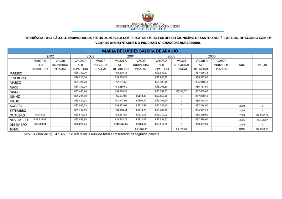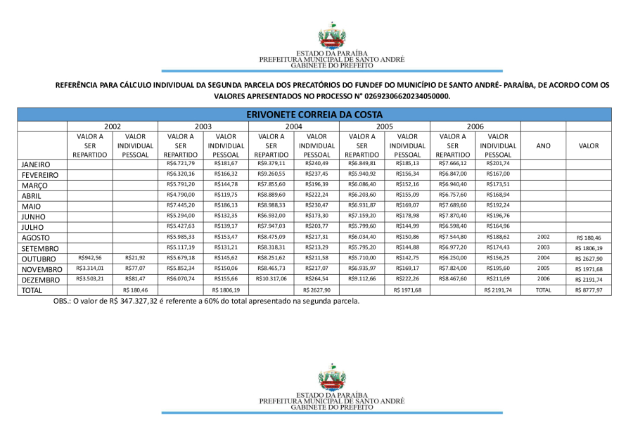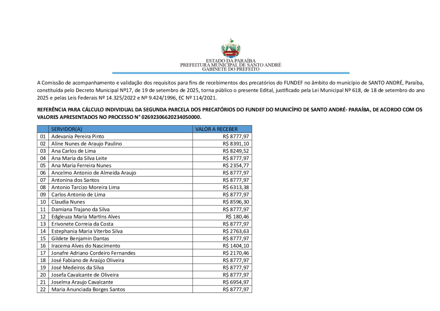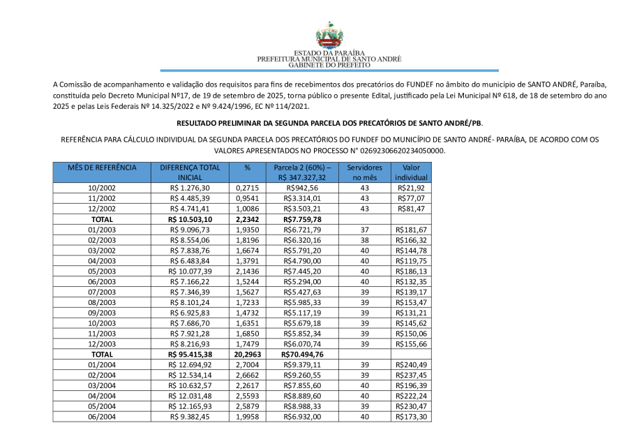 RESULTADO PRELIMINAR DA SEGUNDA PARCELA DOS PRECATÓRIOS DE SANTO ANDRÉ/PB.