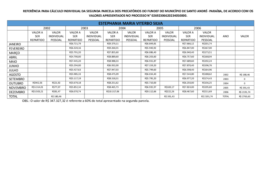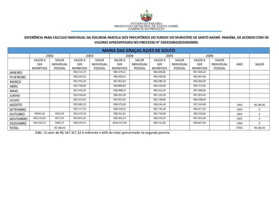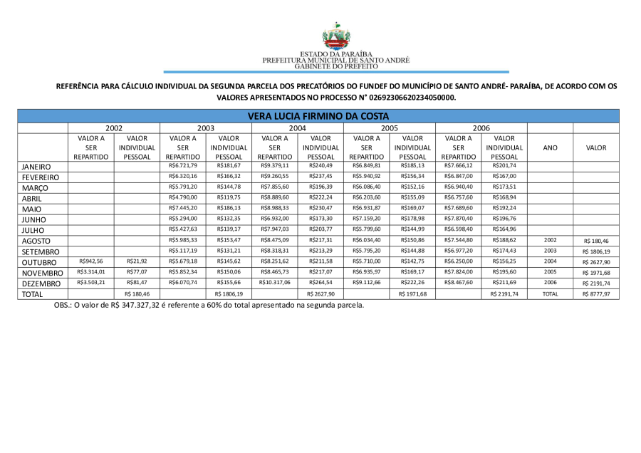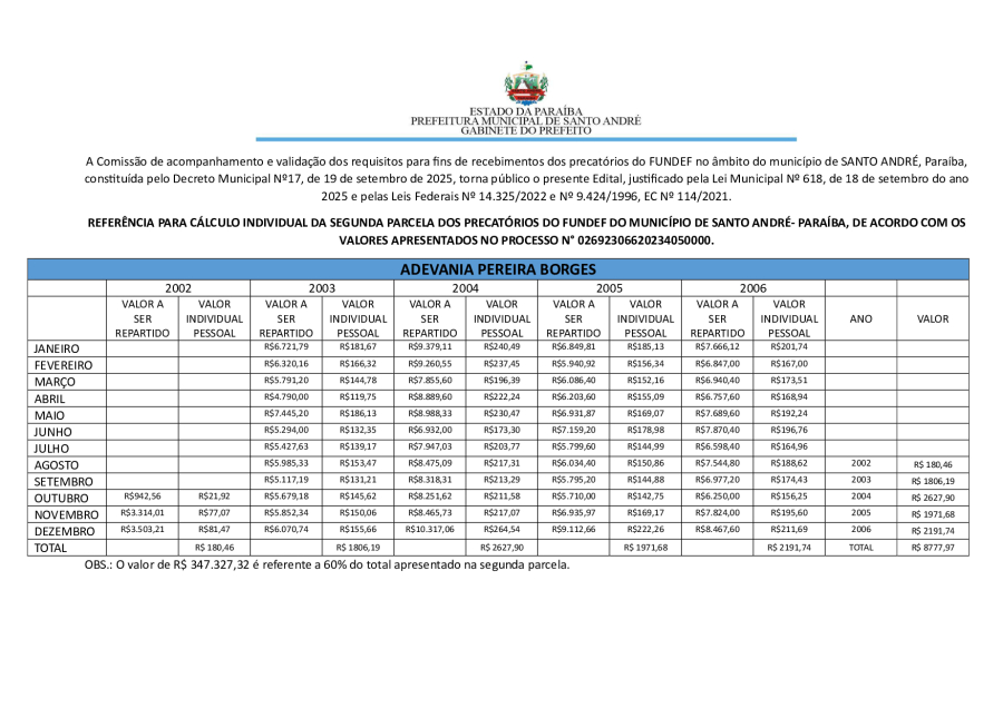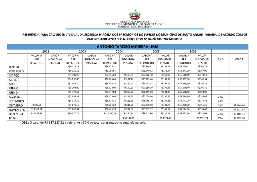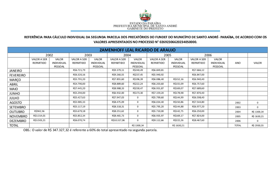 RESULTADO PRELIMINAR DA SEGUNDA PARCELA DOS PRECATÓRIOS DE SANTO ANDRÉ/PB.