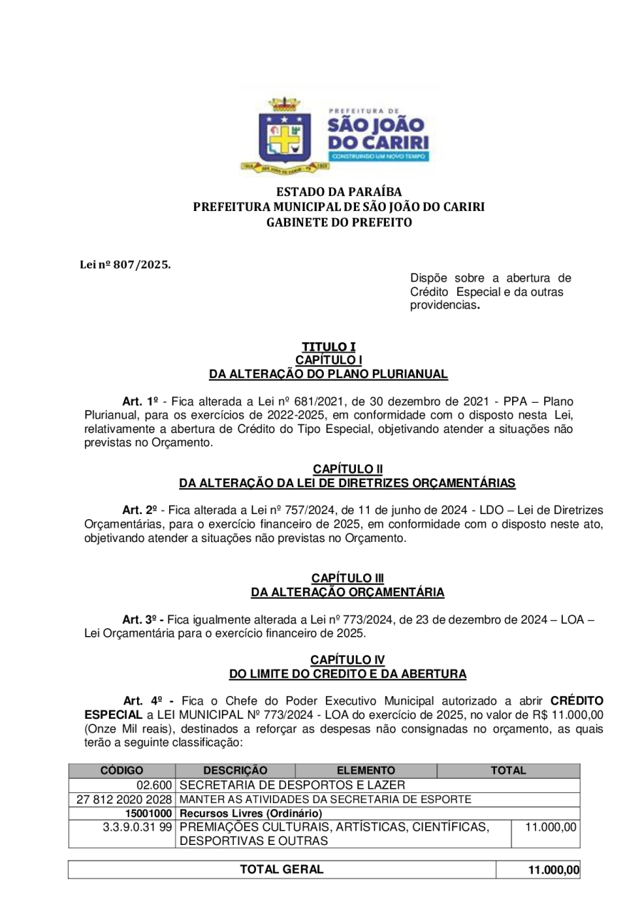 LEI 807/2025 - DISPÕE SOBRE A ABERTURA DE CRÉDITO ESPECIAL E DA OUTRAS PROVIDENCIAS.
