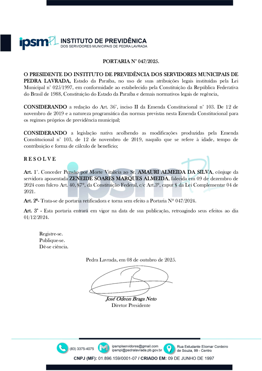 PORTARIA N° 0047/2025 - CONCEDER PENSÃO POR MORTE VITALÍCIA AO SR. AMAURI ALMEIDA DA SILVA,