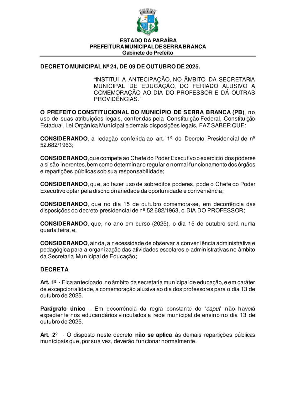 DECRETO MUNICIPAL N° 0024/2025 - INSTITUI A ANTECIPAÇÃO, NO ÂMBITO DA SECRETARIA MUNICIPAL DE EDUCAÇÃO, DO FERIADO ALUSIVO A COMEMORAÇÃO AO DIA DO PROFESSOR
