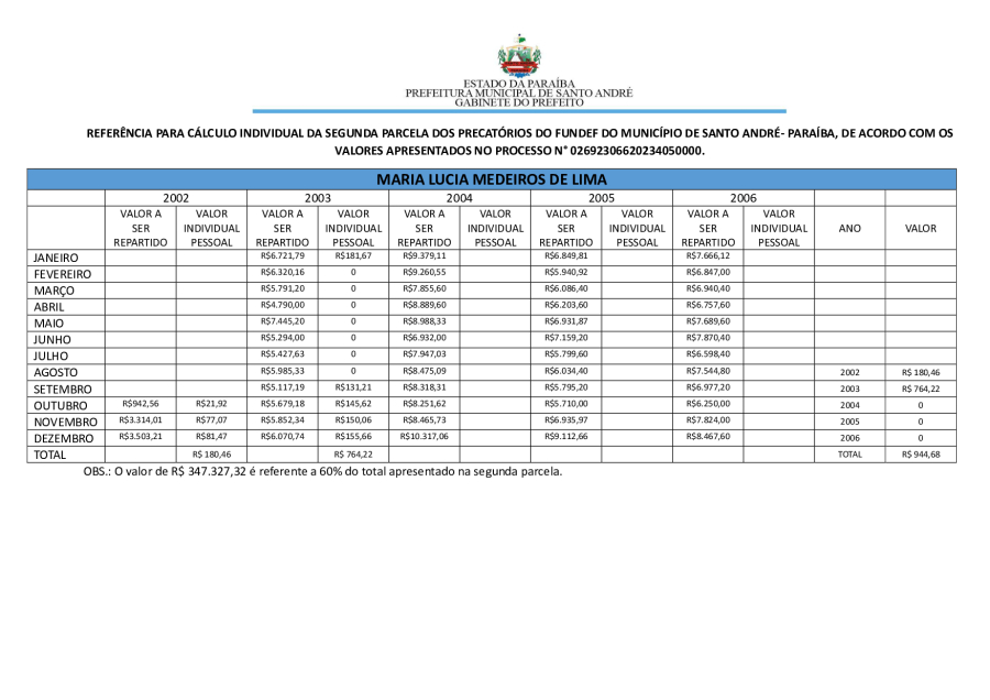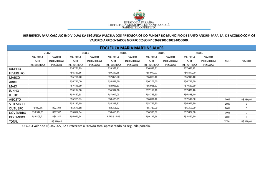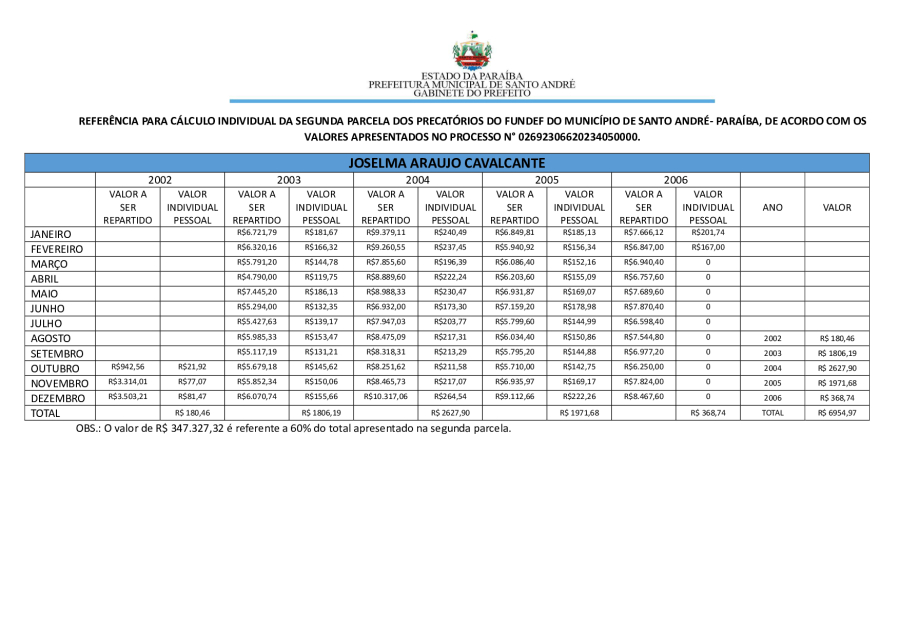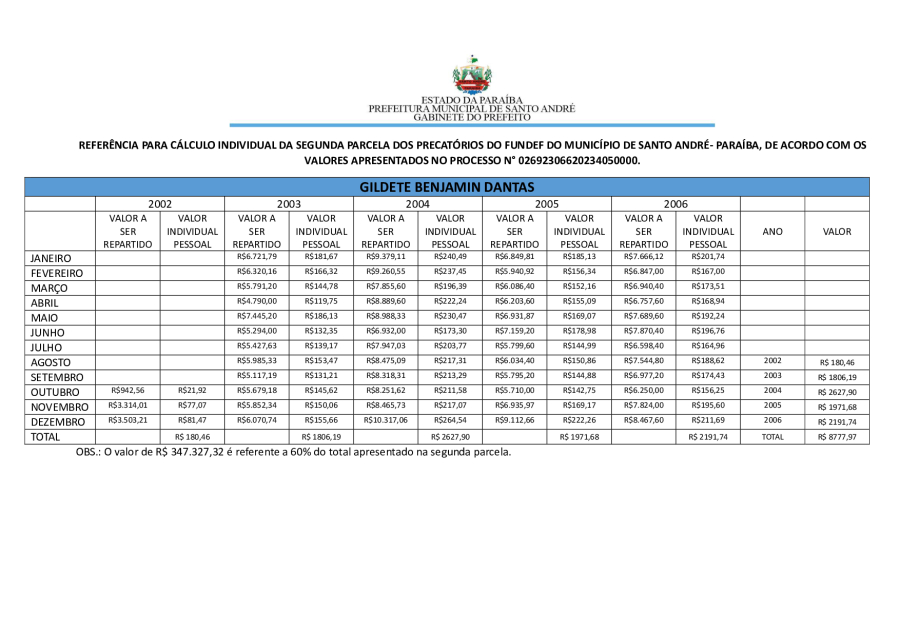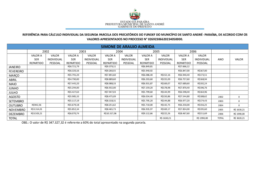 RESULTADO FINAL DA SEGUNDA PARCELA DOS PRECATÓRIOS DE SANTO ANDRÉ/PB PARA HOMOLOGAÇÃO