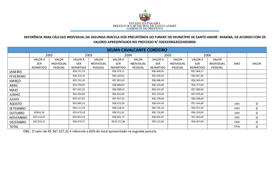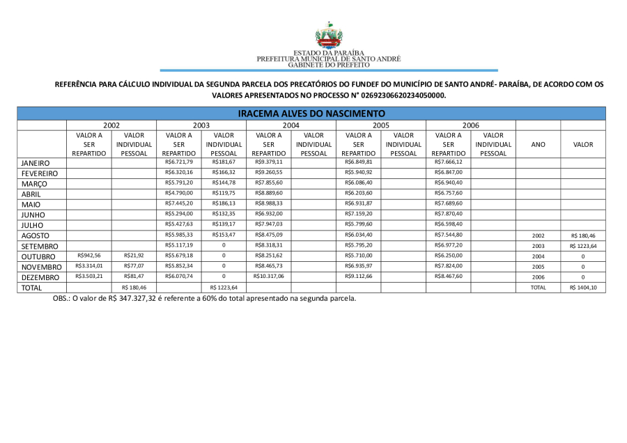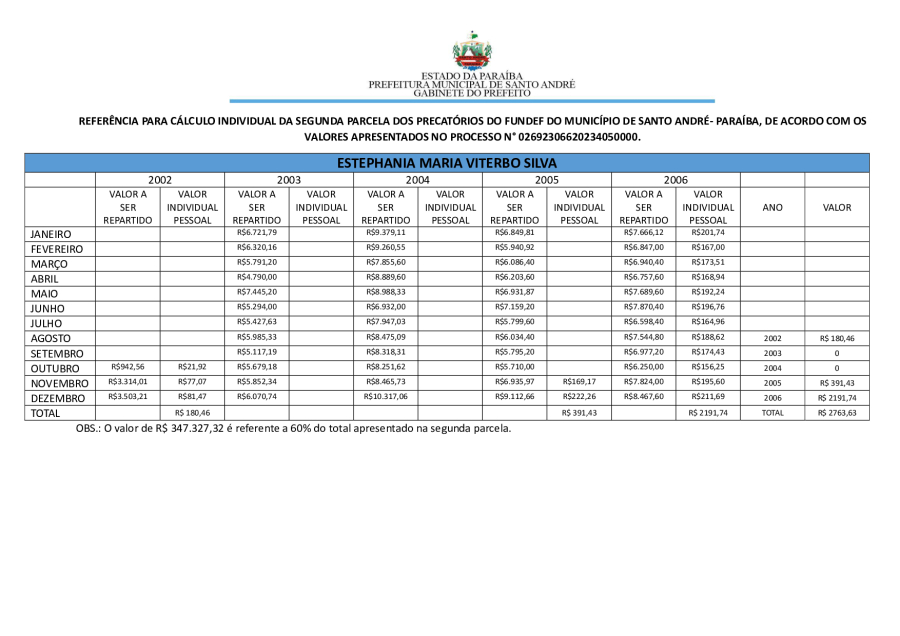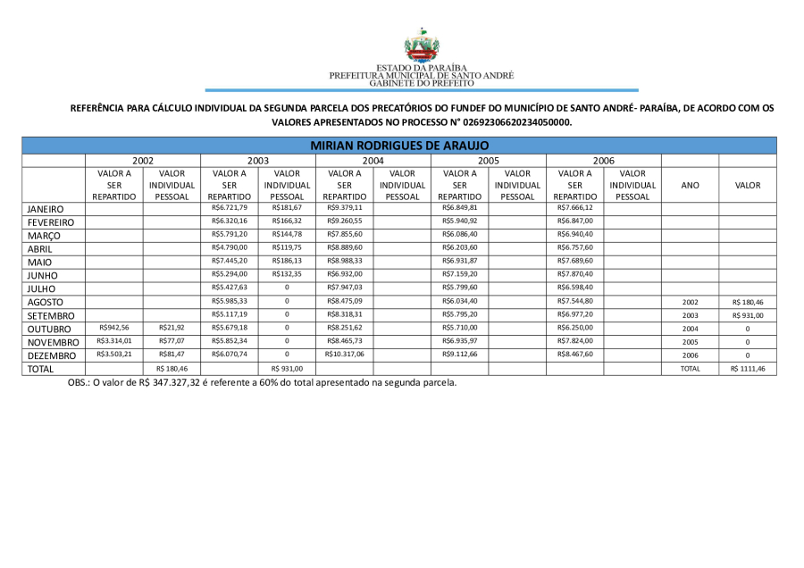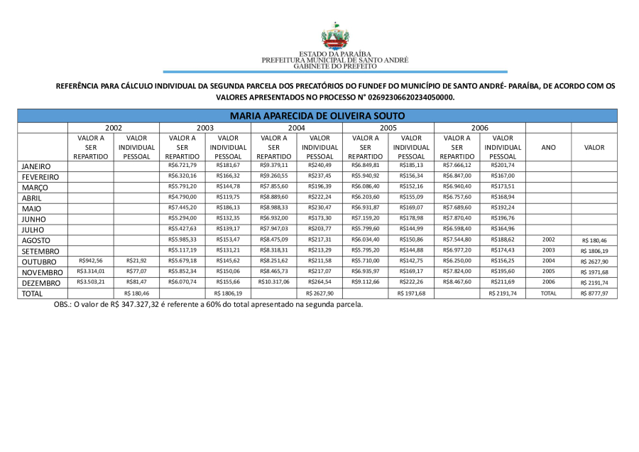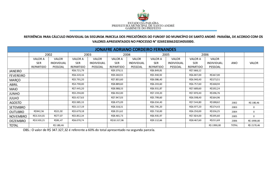 RESULTADO FINAL DA SEGUNDA PARCELA DOS PRECATÓRIOS DE SANTO ANDRÉ/PB PARA HOMOLOGAÇÃO