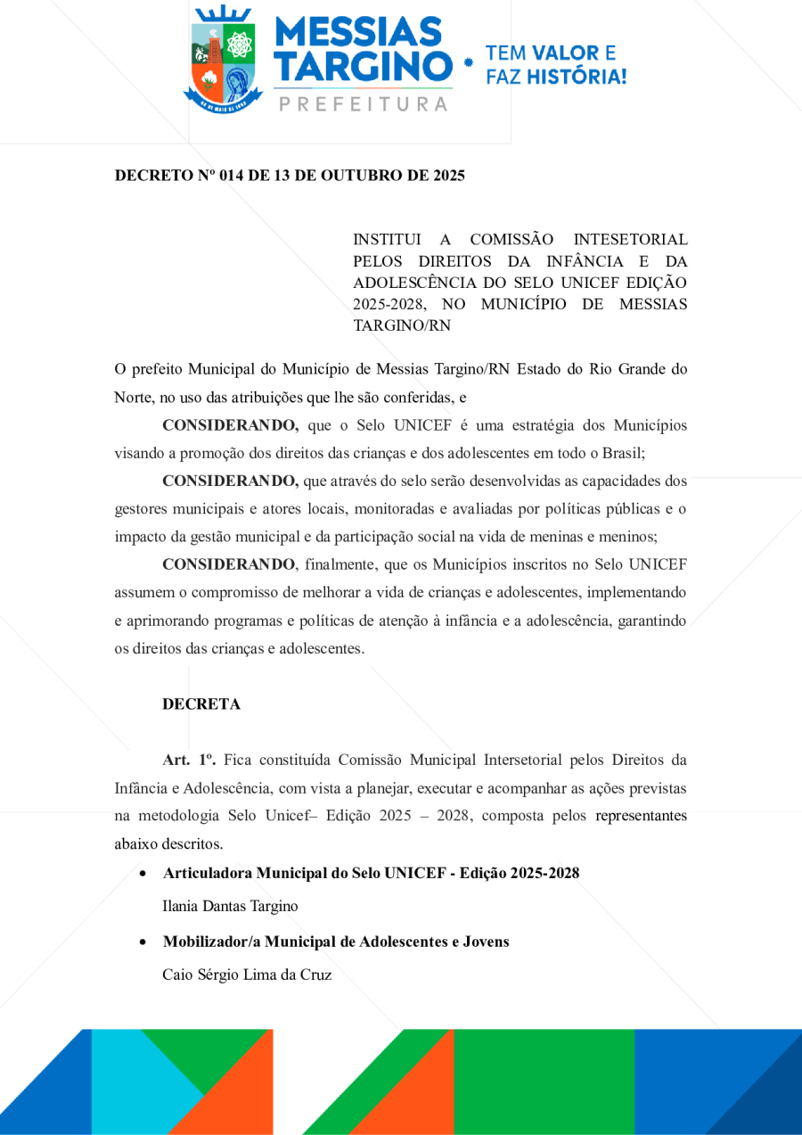 DECRETO Nº014 - INSTITUI A COMISSÃO INTESETORIAL PELOS DIREITOS DA INFÂNCIA E DA ADOLESCÊNCIA DO SELO UNICEF