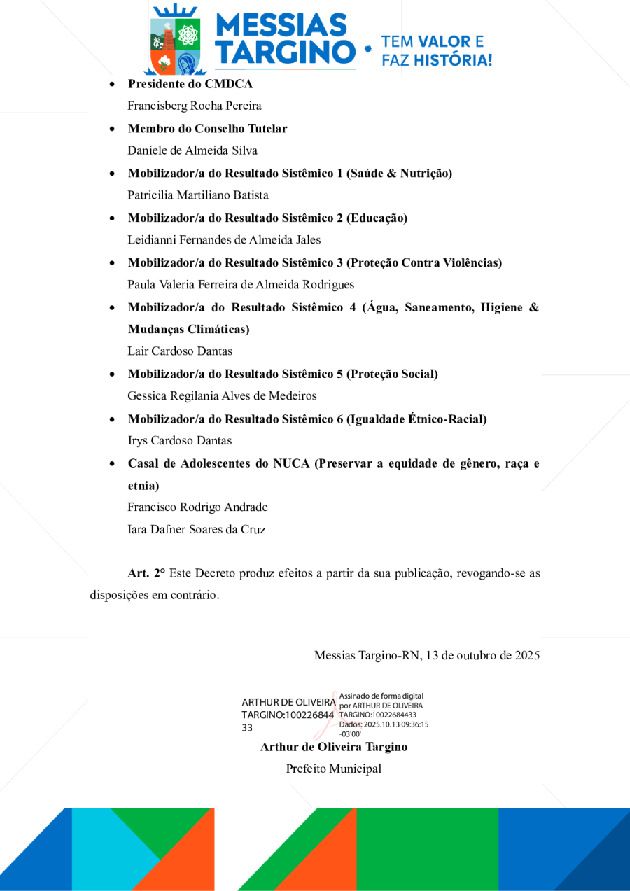 Conforme MP n° 2.200-2 de 24/08/2001, que institui a infraestrutura de chaves Públicas. Matéria Publicada no Diário Oficial do Município de Messias Targino/RN no dia - Edição 01392.