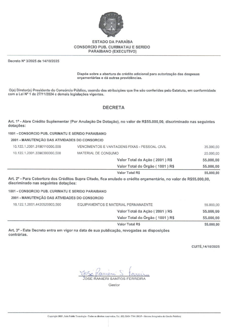 Conforme MP n° 2.200-2 de 24/08/2001, que institui a infraestrutura de chaves Públicas. Matéria Publicada no Diário Oficial do Consórcio Intermunicipal de Saúde do Curimataú e Seridó Paraibano/PB no dia - Edição 01329.
