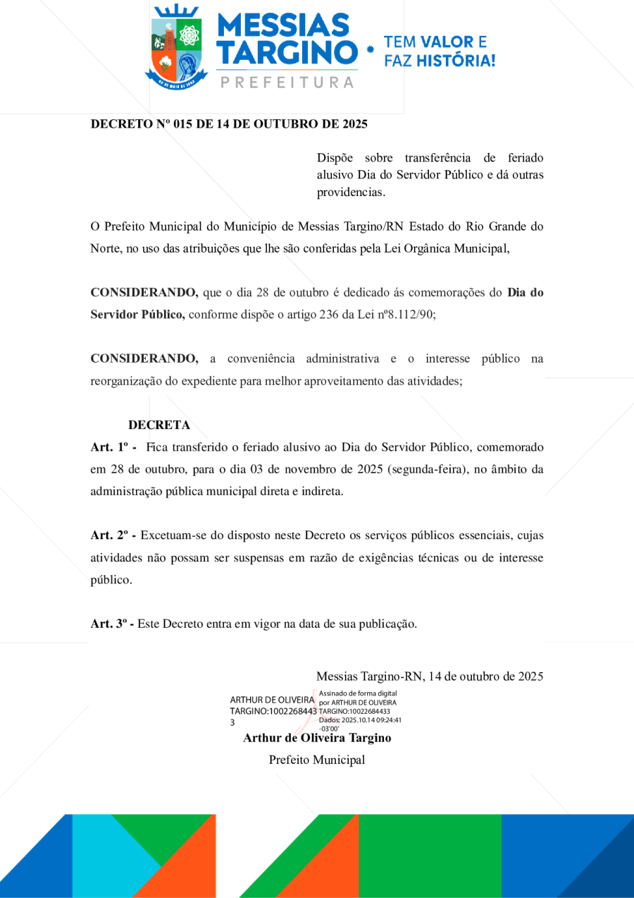 Conforme MP n° 2.200-2 de 24/08/2001, que institui a infraestrutura de chaves Públicas. Matéria Publicada no Diário Oficial do Município de Messias Targino/RN no dia - Edição 01393.