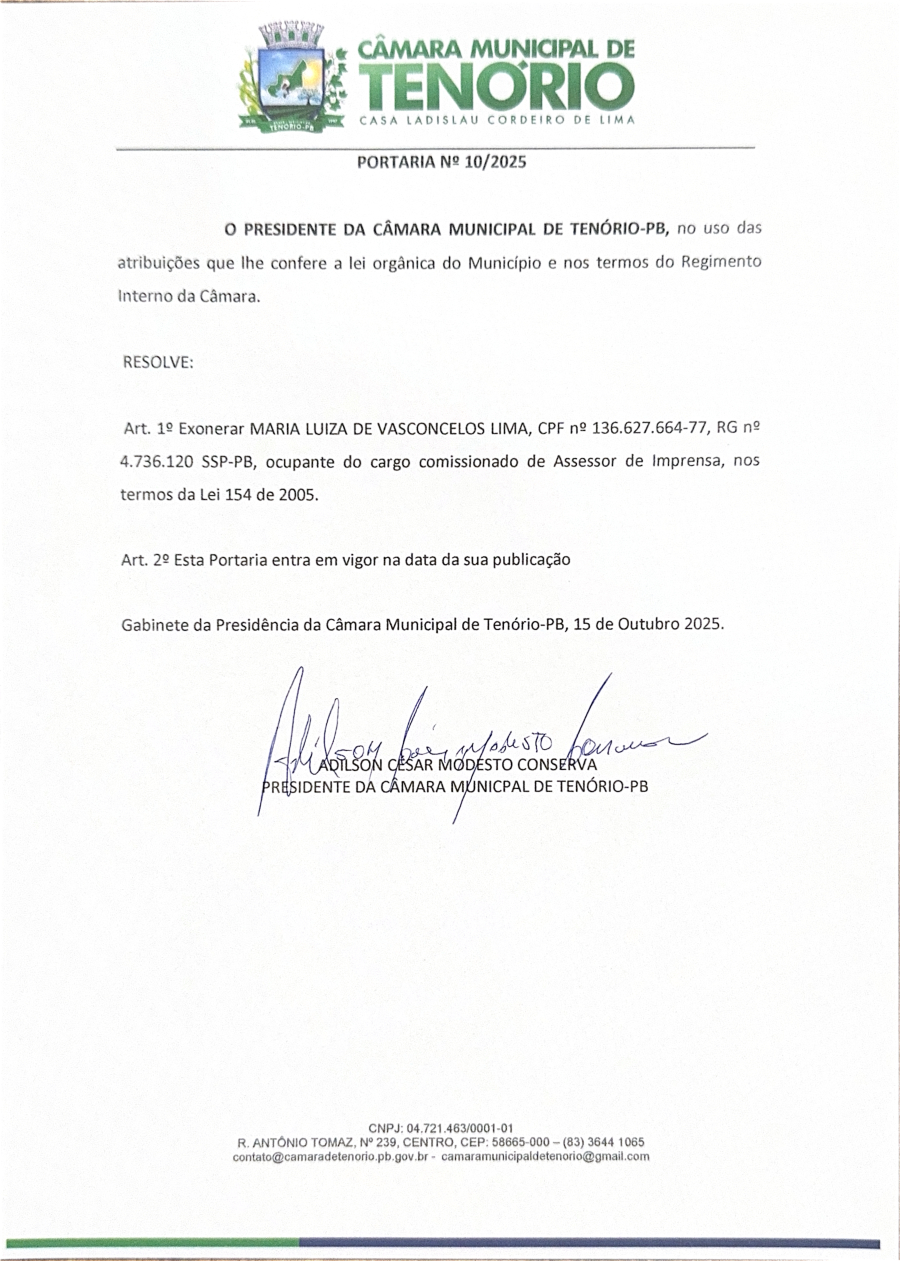 PORTARIA N° 0010/2025 - EXONERAÇÃO DE MARIA LUIZA DE VASCONCELOS LIMA
