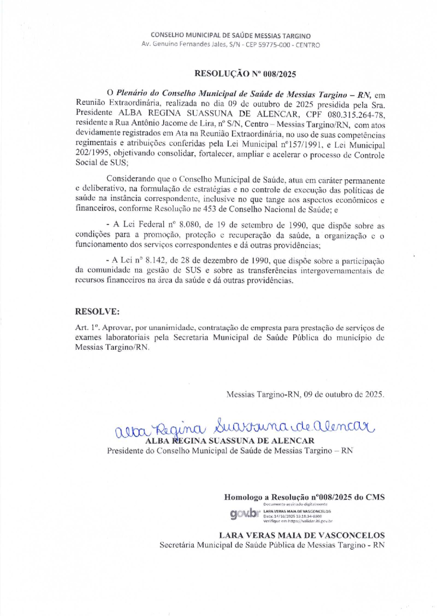 Conforme MP n° 2.200-2 de 24/08/2001, que institui a infraestrutura de chaves Públicas. Matéria Publicada no Diário Oficial do Município de Messias Targino/RN no dia - Edição 01395.