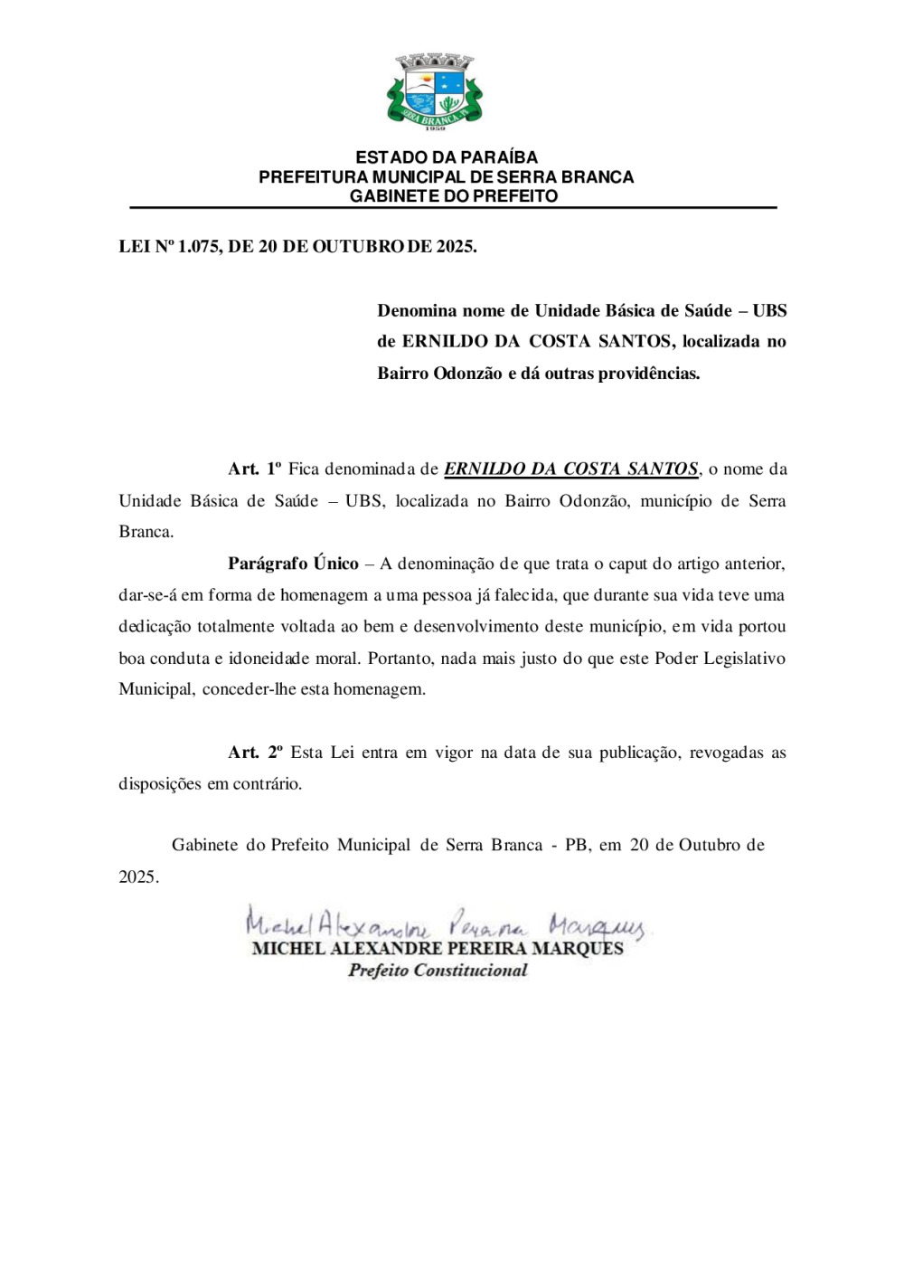 LEI Nº 1075/2025 - DENOMINA NOME DE UNIDADE BÁSICA DE SAÚDE – UBS DE ERNILDO DA COSTA SANTOS, LOCALIZADA NO BAIRRO ODONZÃO