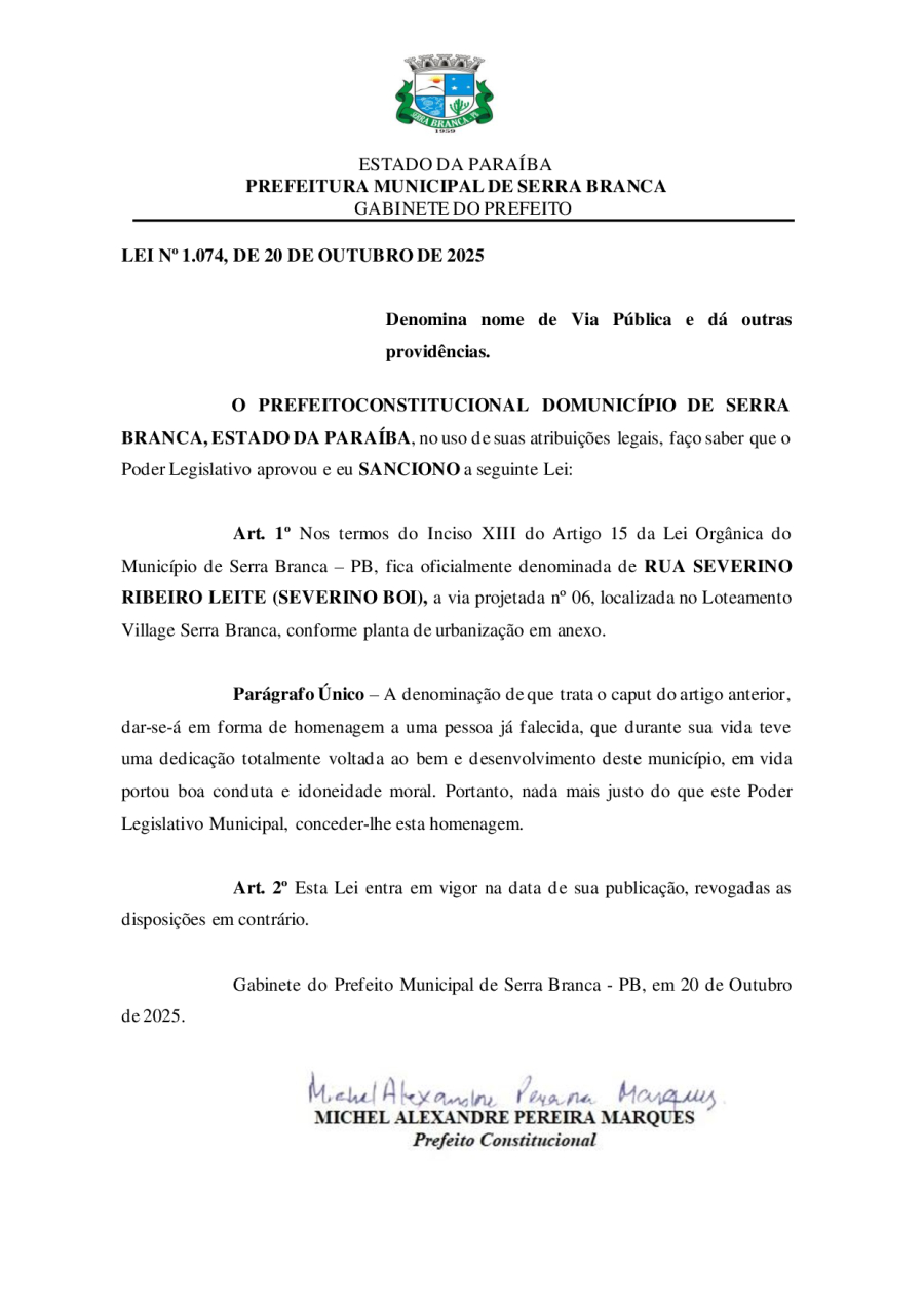 LEI Nº 1074/2025 - DENOMINA NOME DE VIA PÚBLICA