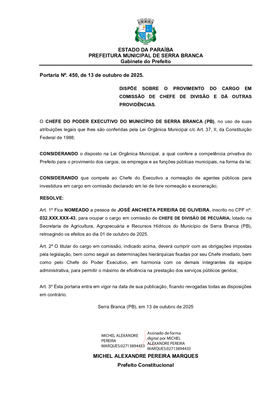 PORTARIA N° 0450/2025 - NOMEAÇÃO DE JOSÉ ANCHIETA PEREIRA DE OLIVEIRA