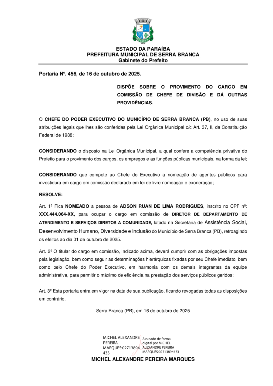 PORTARIA N° 0456/2025 - NOMEAÇÃO DE ADSON RUAN DE LIMA RODRIGUES