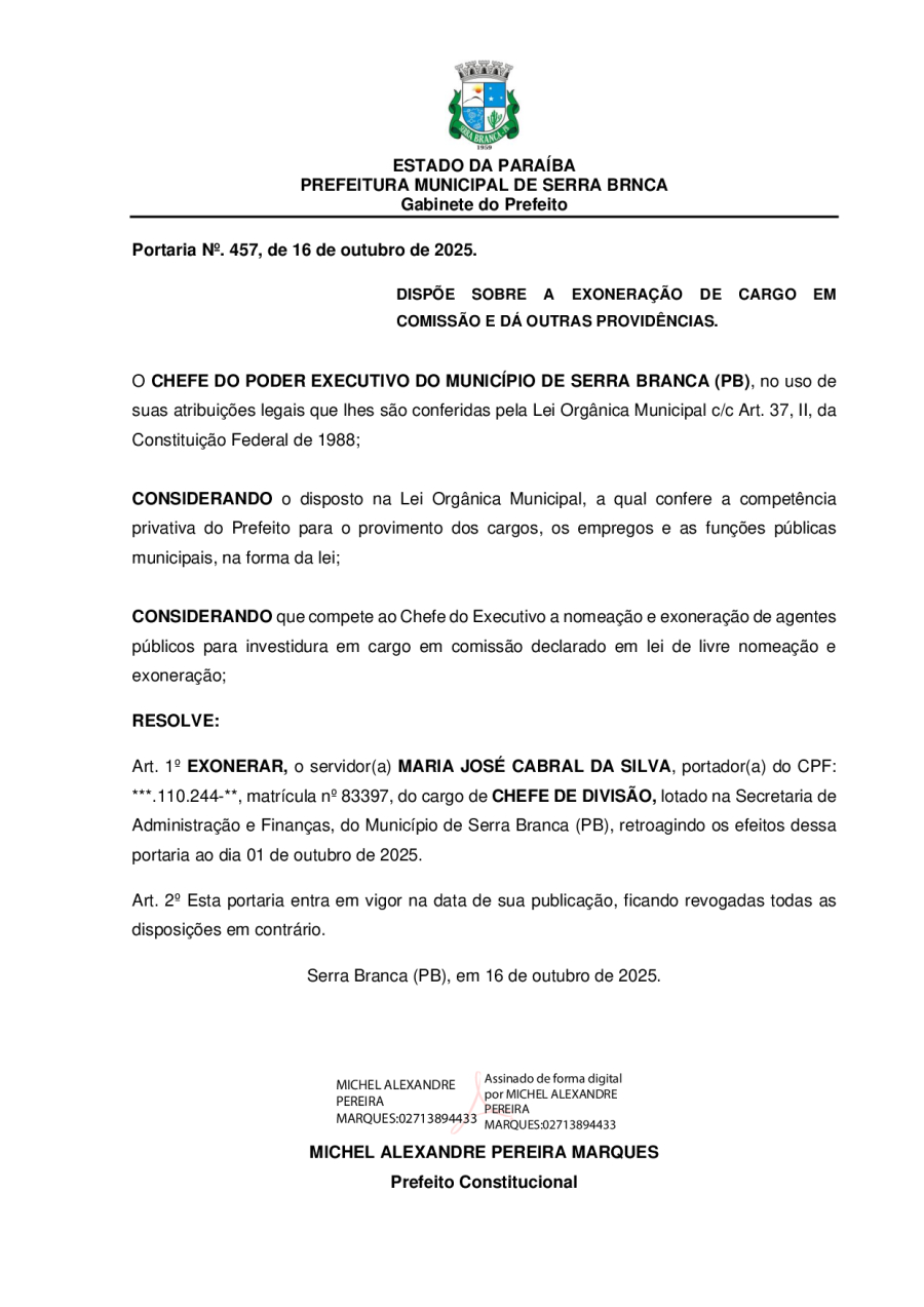 PORTARIA N° 0457/2025 - EXONERAÇÃO DE MARIA JOSÉ CABRAL DA SILVA