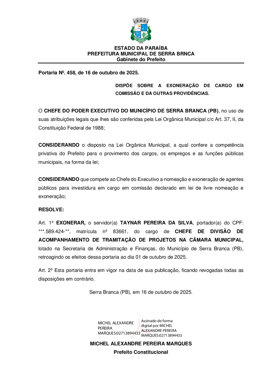 PORTARIA N° 0458/2025 - EXONERAÇÃO DE TAYNAR PEREIRA DA SILVA