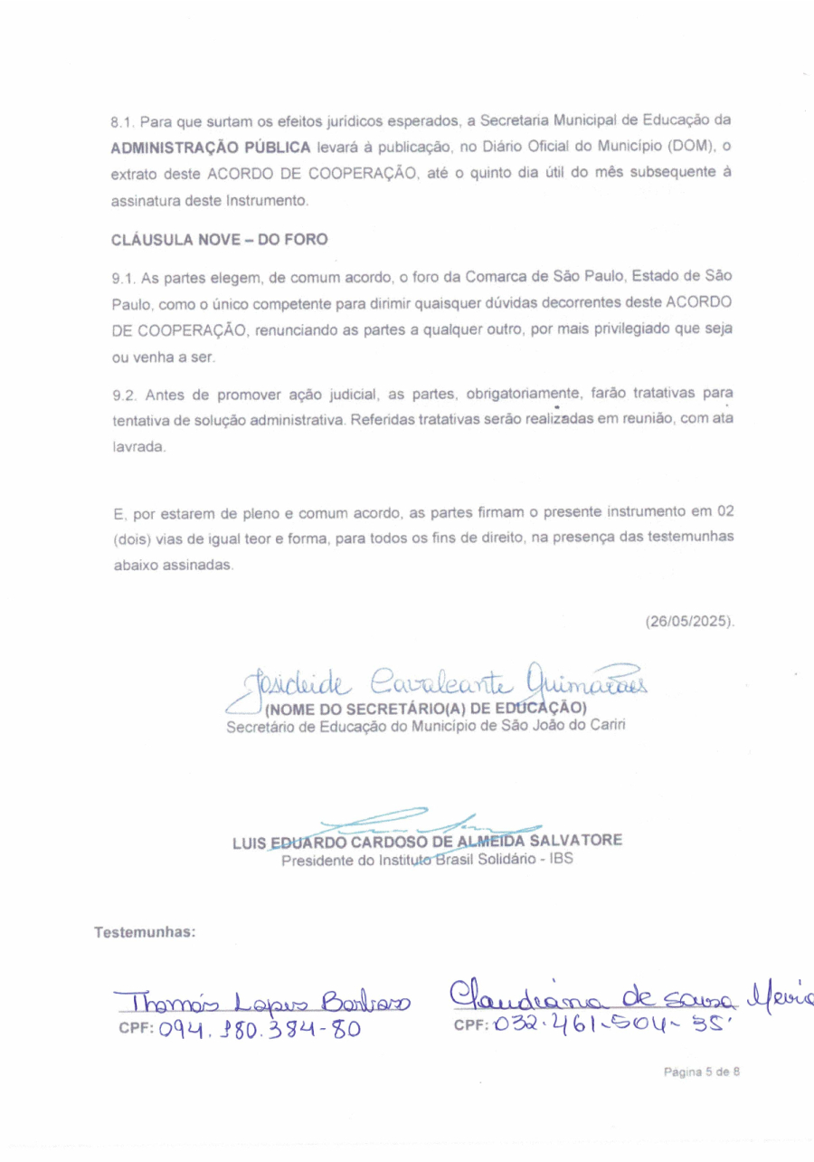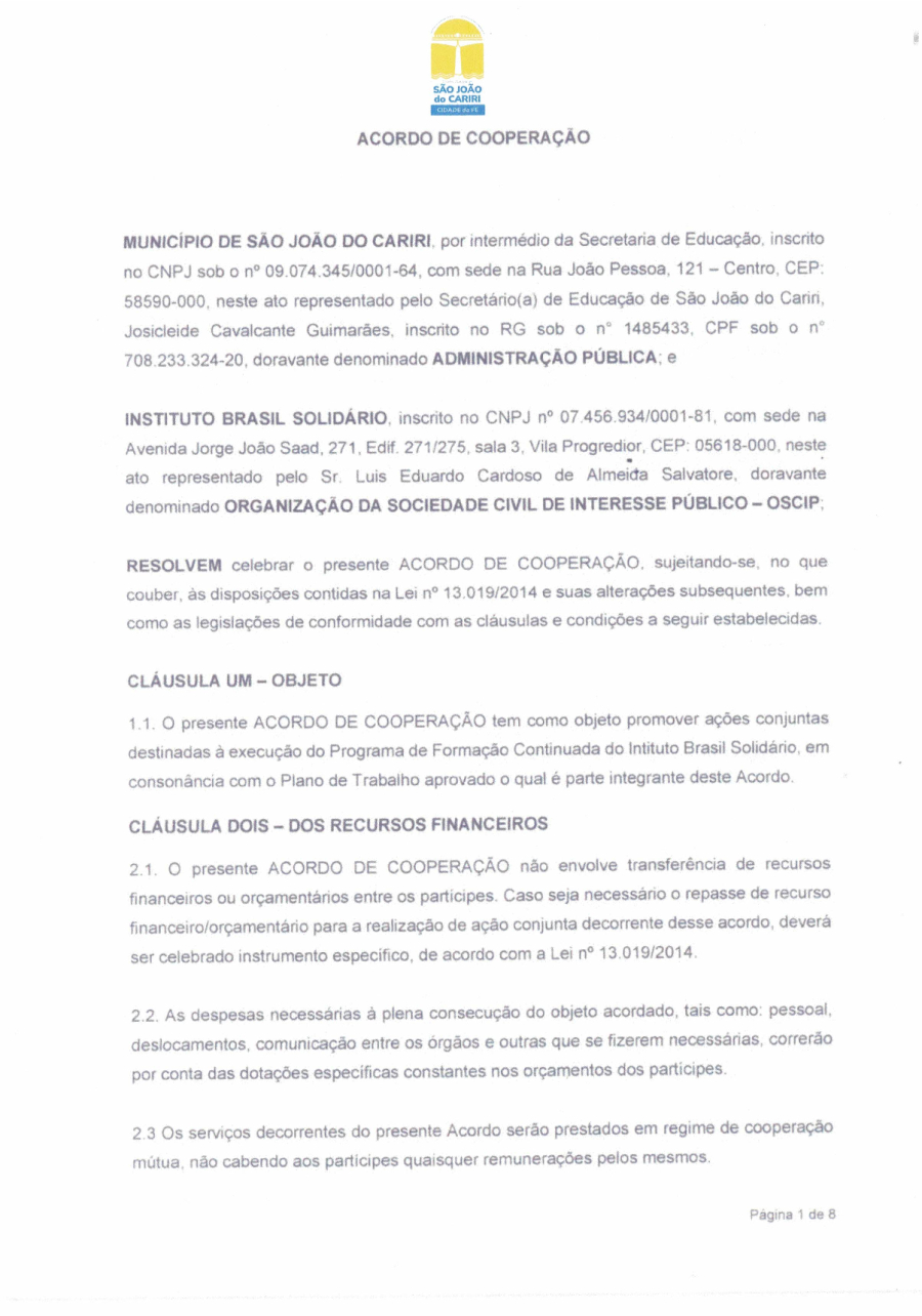 ACORDO DE COOPERAÇÃO - MUNICIPIO DE SÃO JOÃO DO CARIRI/INSTITUTO BRASIL SOLIDÁRIO