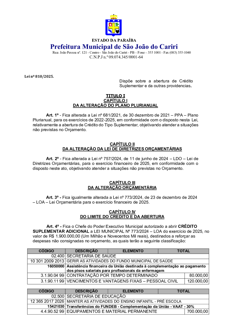 LEI 810/2025 - DISPÕE SOBRE A ABERTURA DE CRÉDITO SUPLEMENTAR E DA OUTRAS PROVIDENCIAS