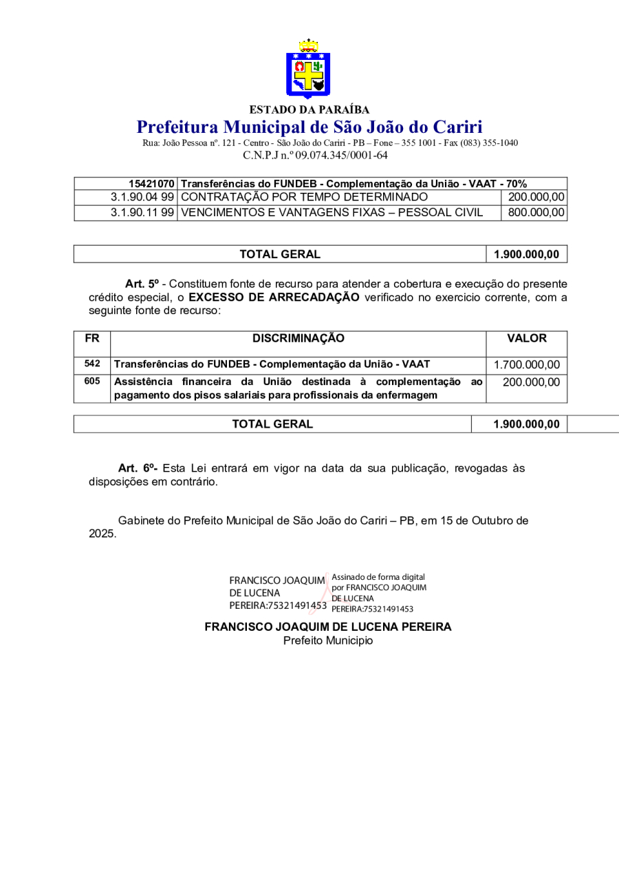 Conforme MP n° 2.200-2 de 24/08/2001, que institui a infraestrutura de chaves Públicas. Matéria Publicada no Diário Oficial do Município de São João do Cariri/PB no dia - Edição 01842.