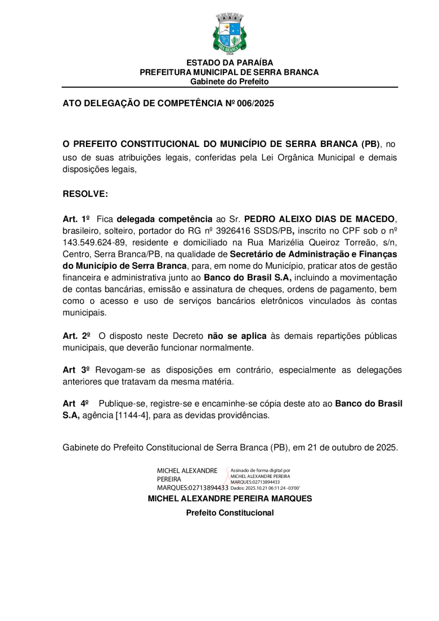 ATO DELEGAÇÃO DE COMPETÊNCIA Nº 006/2025