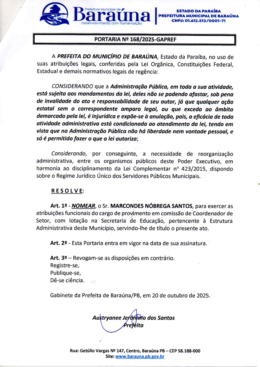 PORTARIA Nº 168/2025-GAPREF - NOMEAR O SR. MARCONDES NOBREGA SANTOS, PARA EXERCER AS ATRIBUIÇÕES FUNCIONAIS DO CARGO DE PROVIMENTO EM COMISSÃO DE COORDENADOR DE SETOR. - 23 DE OUTUBRO DE 2025.