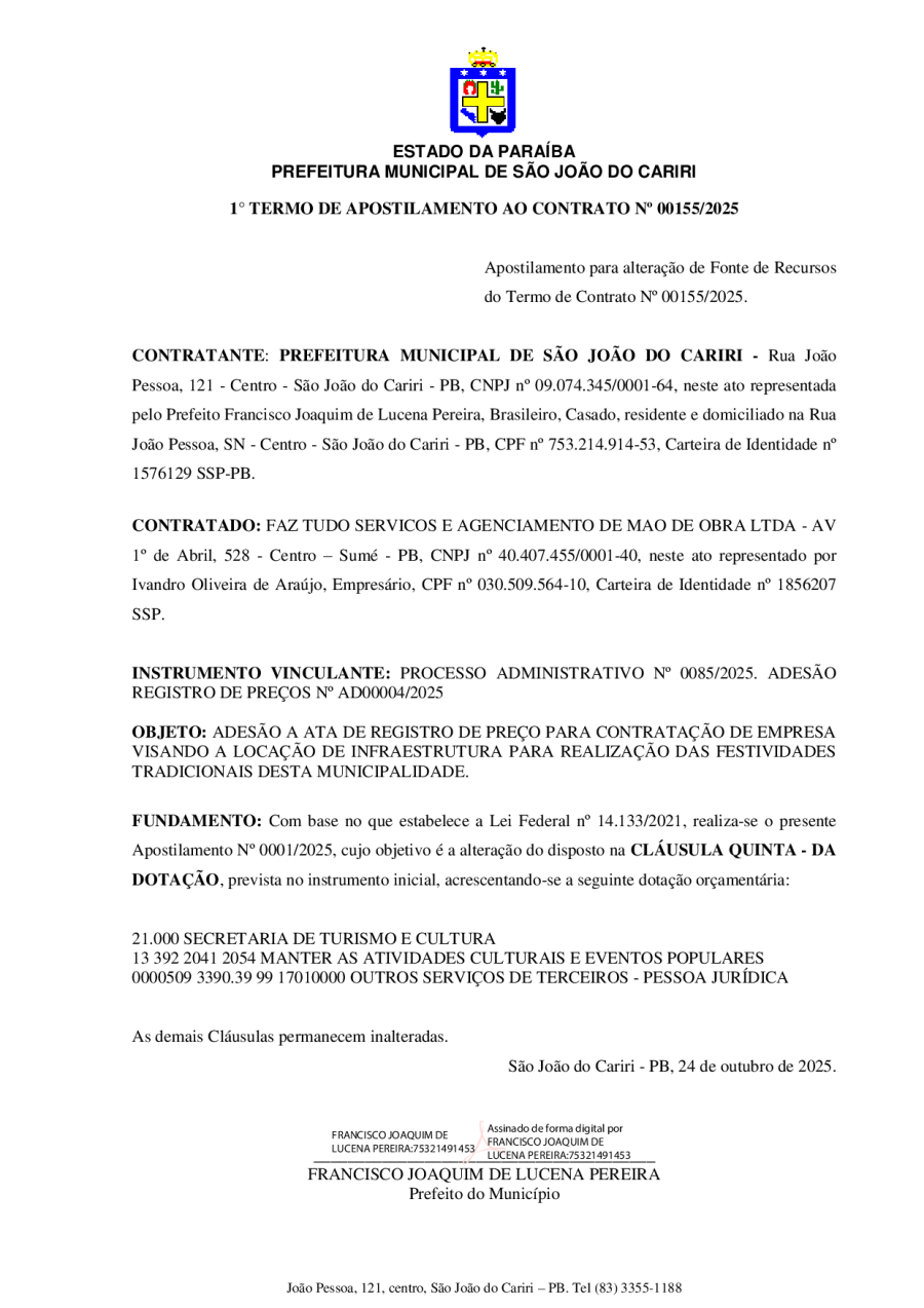 1° TERMO DE APOSTILAMENTO AO CONTRATO Nº 00155/2025
