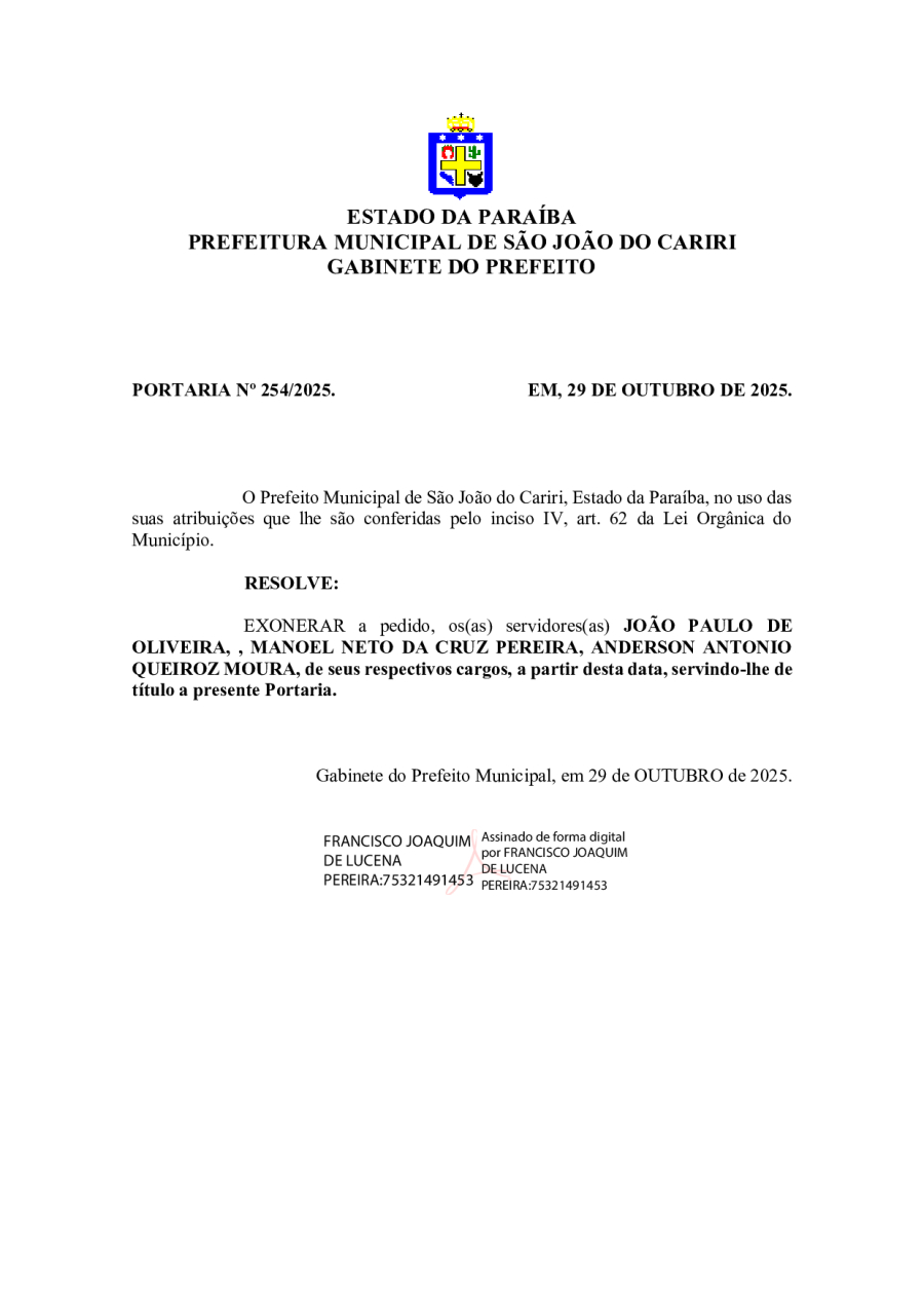 PORTARIA 254/2025 - EXONERAÇÃO JOÃO PAULO DE OLIVEIRA, , MANOEL NETO DA CRUZ PEREIRA, ANDERSON ANTONIO QUEIROZ MOURA