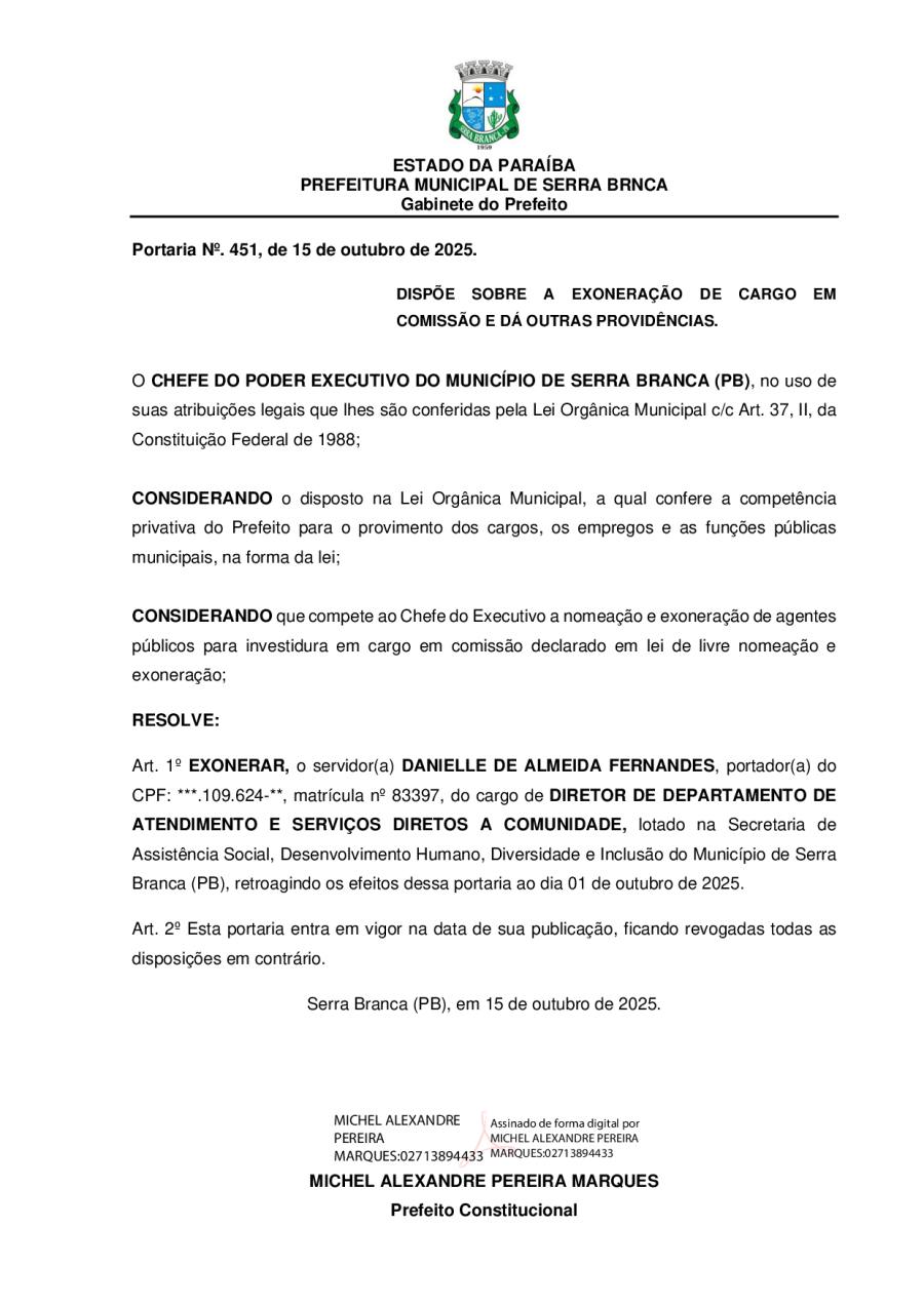 PORTARIA N° 0451/2025 - EXONERAÇÃO DE DANIELLE DE ALMEIDA FERNANDES