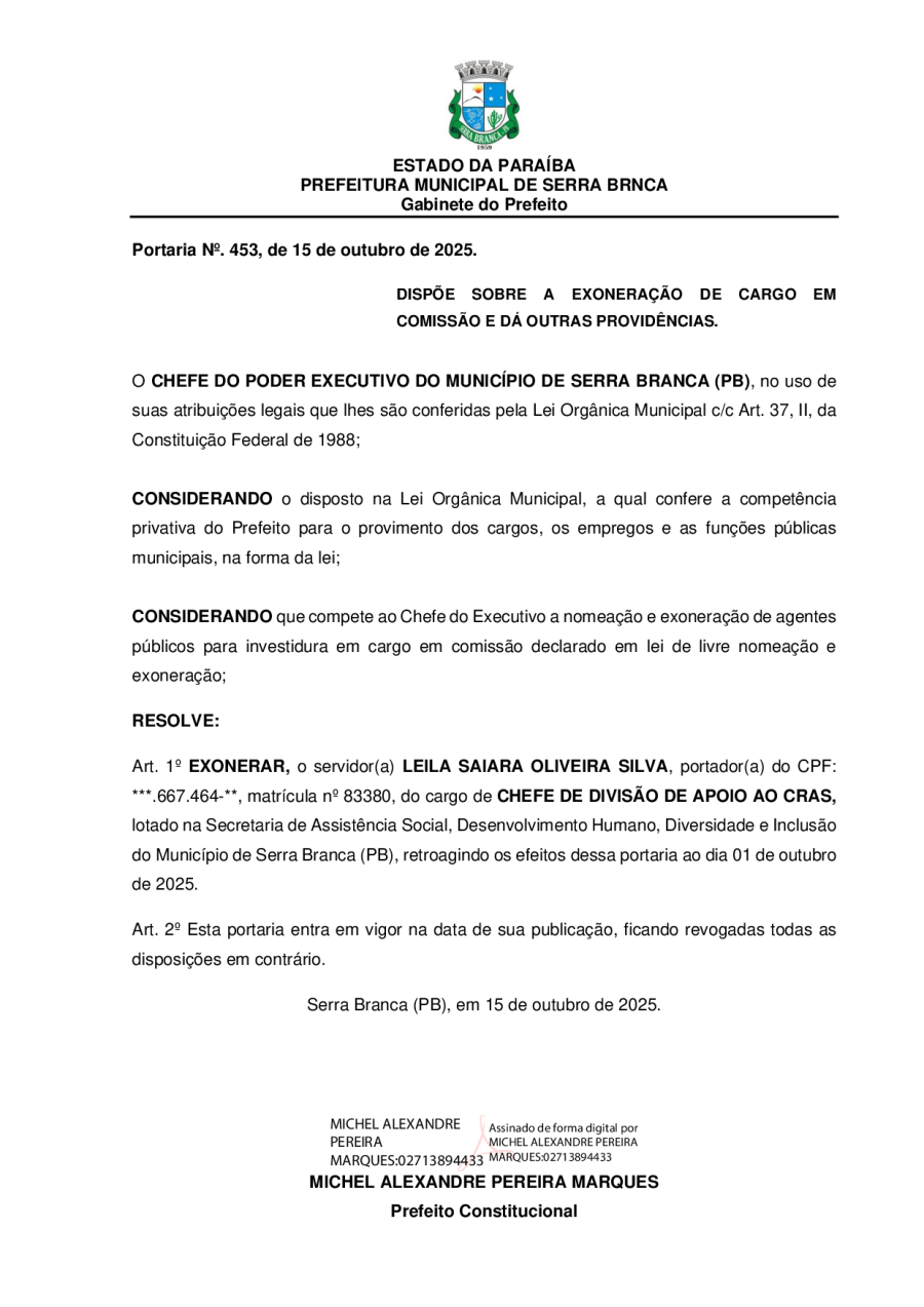 PORTARIA N° 0453/2025 - EXONERAÇÃO DE LEILA SAIARA OLIVEIRA SILVA