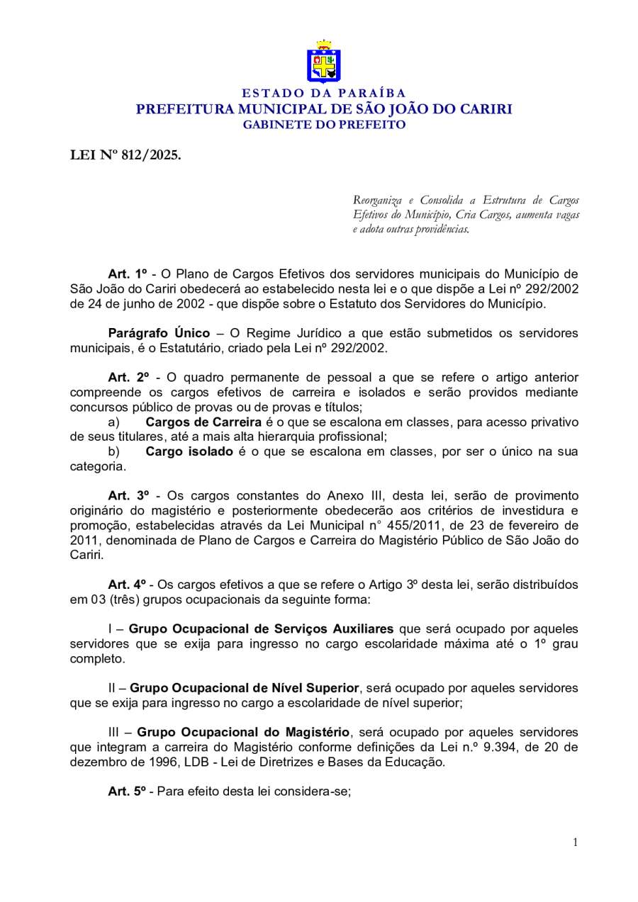 LEI 812/2025 - REORGANIZA E CONSOLIDA A ESTRUTURA DE CARGOS EFETIVOS DO MUNICÍPIO, CRIA CARGOS, AUMENTA VAGAS E ADOTA OUTRAS PROVIDÊNCIAS.