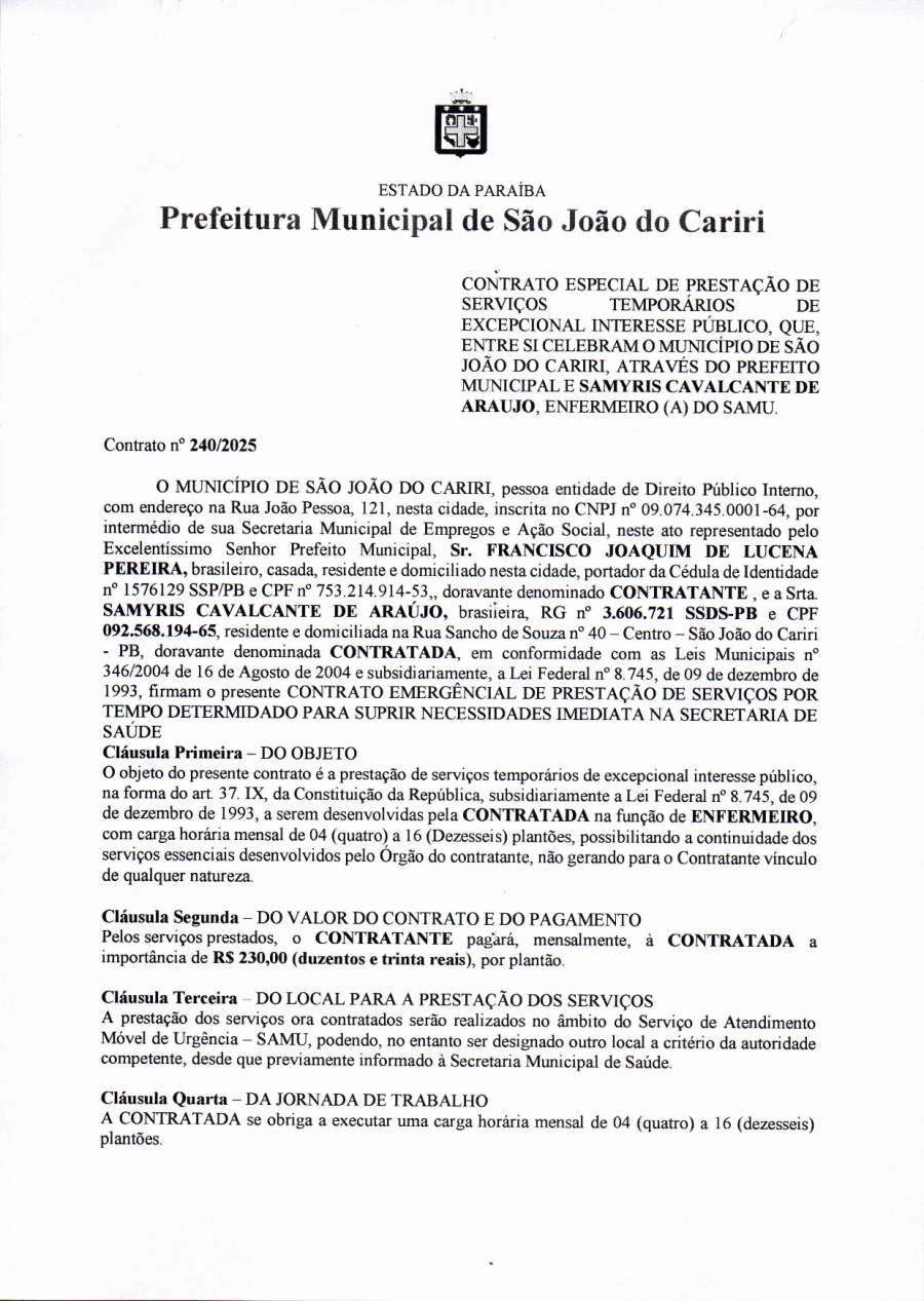 CONTRATO 240/2025 - SAMYRIS CAVALCANTE DE ARAUJO