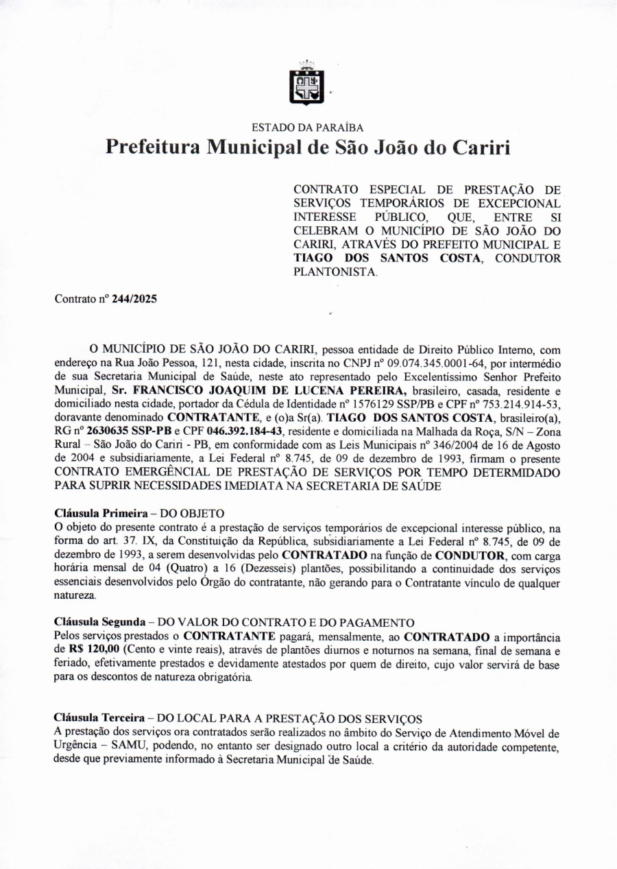 CONTRATO 244/2025 - TIAGO DOS SANTOS COSTA
