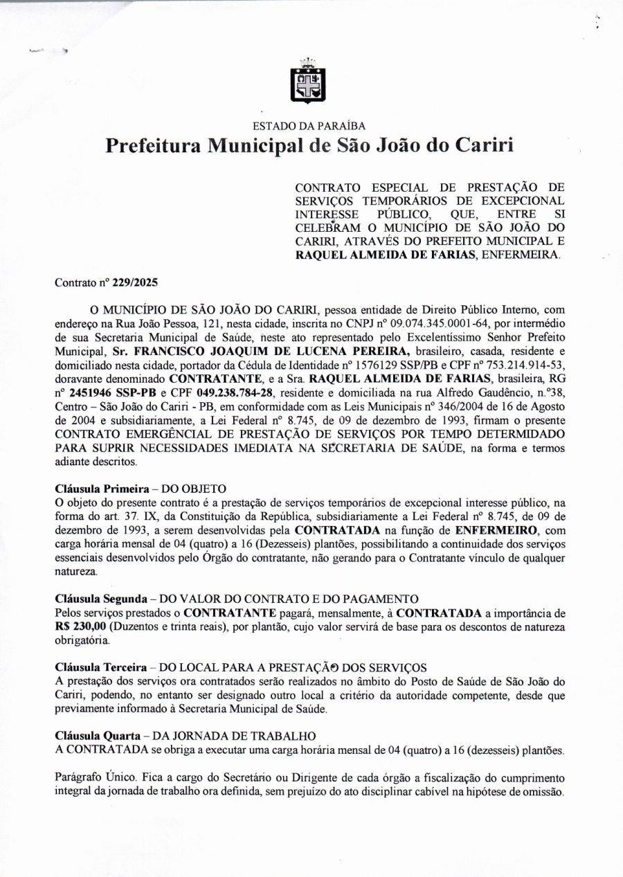 CONTRATO 229/2025 - RAQUEL ALMEIDA DE FARIAS